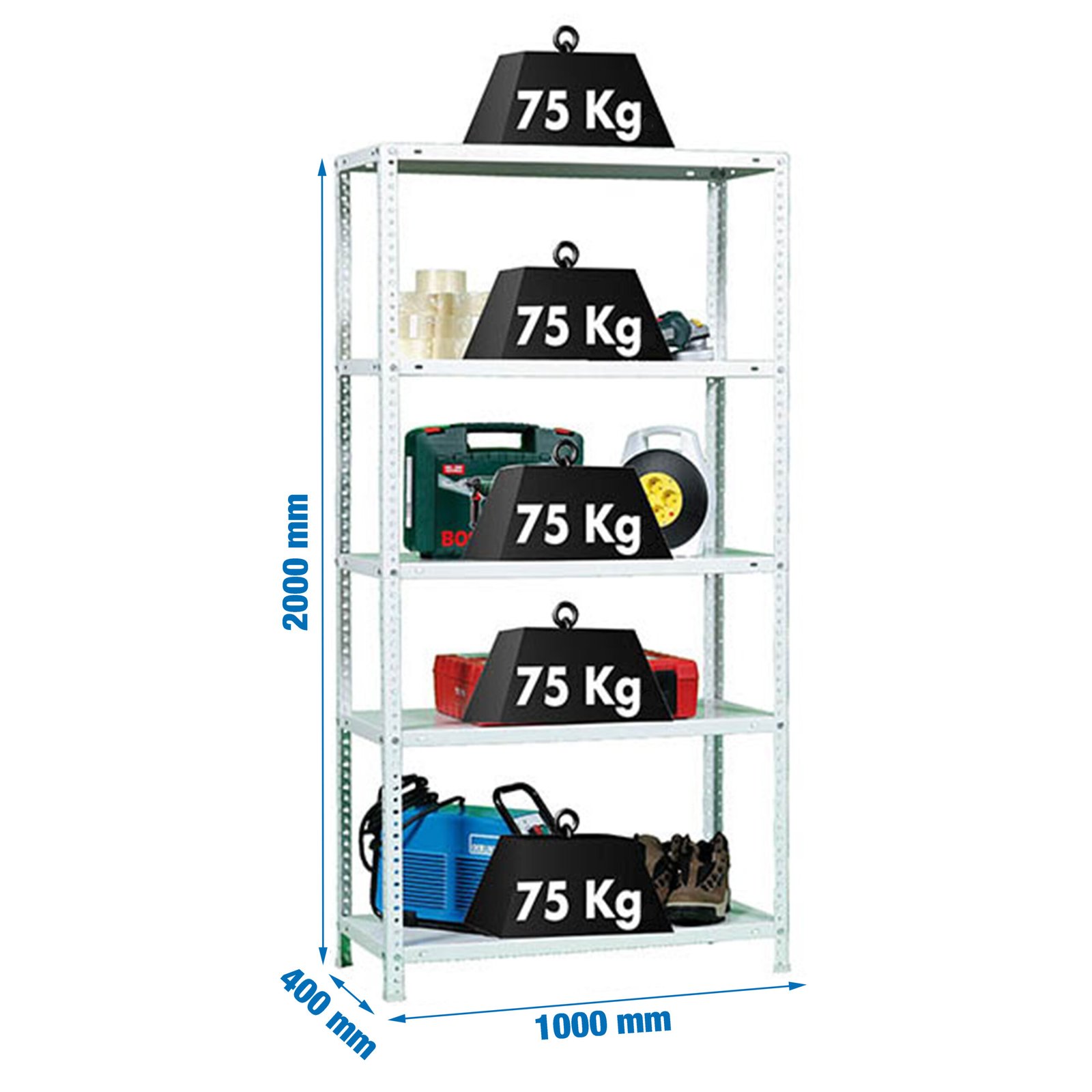 Estanteria metalica con tornillos de color BLANCO con capacidad de carga por estante de 75 kg. El numero de estantes es 5 y las medidas (alto x ancho x fondo) son 2000x1000x400 mm. Producto europeo, calidad europea, podras encontrar las instrucciones de montaje en su interior o en este enlace, https, //www. youtube. com/watch?v=4HO6NqZuG-s. Medidas en uso del producto, 2000x1100x410 mm
