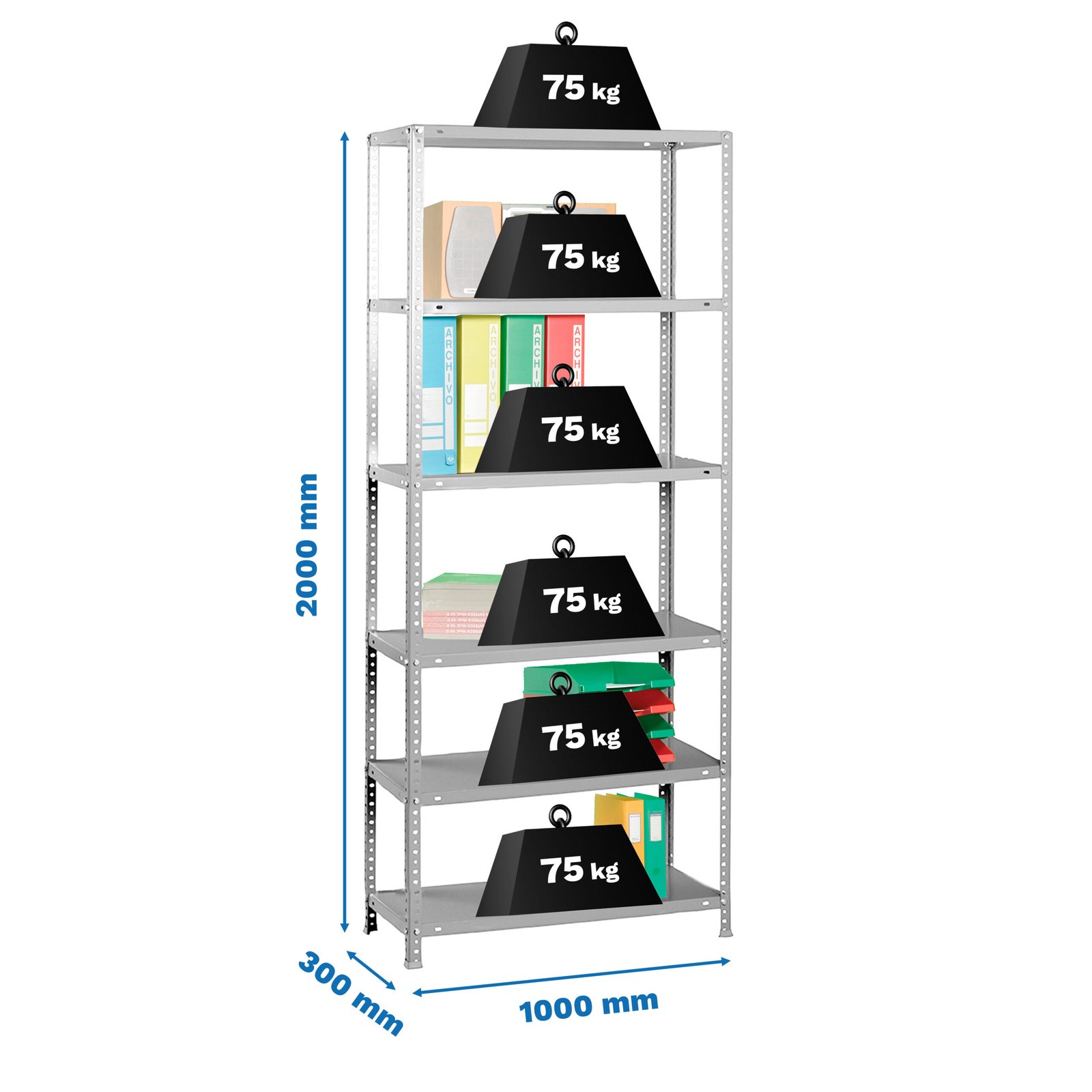 Estanteria metalica con tornillos, Advantage plus 6-300 de color GRIS. Tiene 6 estantes. Estructura de color gris y bandejas de metal. Las dimensiones de esta estanteria (alto x ancho x fondo) son, 2000x1000x300 mm. Tiene una capacidad de carga de 75 kgs por estante, certificamos a punto de flexion, no de rotura. No se tambalea y no tiene aristas de corte. Estanteria Fabricada en Europa por Simonrack y se monta rapido siguiendo las instrucciones. Podras encontrar las instrucciones de montaje en su interior o en este enlace, https, //www. youtube. com/watch?v=4HO6NqZuG-s