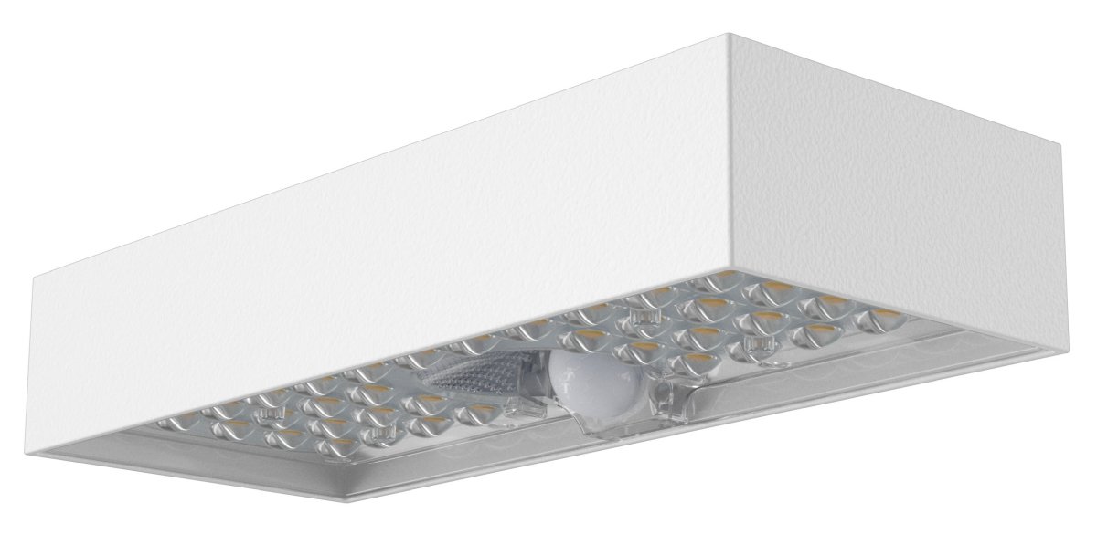 Aplique solar LED fabricado en policarbonato anti-UV y ABS con diseño contemporáneo y refinado.