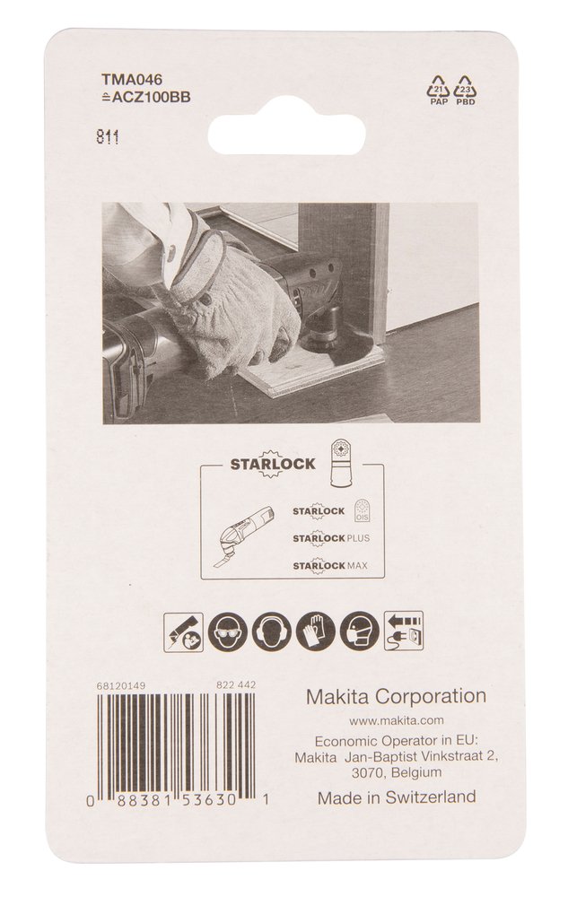 Starlock • 15 TPI • BiM • D MA046 • Madera / Metal DescripciónCuchilla multiherramienta STARLOCK especialmente diseñada para cortar materiales como aluminio, madera, epoxi y yeso. Esta hoja bimetálica tiene un ancho de 100. La hoja tiene 15 TPI. El paquete contiene 1 hoja. Cuchilla multiherramienta con soporte STARLOCK. También es adecuada para multiherramientas con soporte STARLOCK PLUS y STARLOCK MAX. STARLOCK proporciona un rápido clic de bloqueo de la cuchilla y es capaz de transferir alta fuerza. Hoja STARLOCK está codificado por colores para una fácil identificación. La cuchilla está diseñada para serrar piezas a lo largo. Está hecha de bi-metal (BiM). Es un material que puede soportar la flexión y cortar a través de materiales duros sin dientes de cuchillas opacificantes. Lo que es adecuado para el corte a través de materiales duros con una larga vida útil. Especificaciones técnicasAnchura, 100 mmTipo de cuchilla, BiMDientes por pulgada, 15Cantidad, 1Otras características relevantesAluminio Contrachapado Epoxy Hoja de sierra bimetálica Madera MultiherramientaStarlock