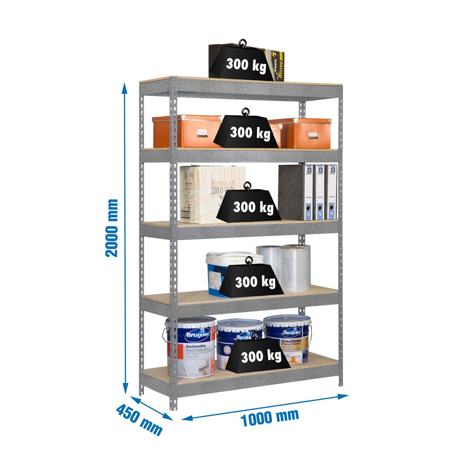 Estanteria metalica sin tornillos de color GALVA/MADERA con capacidad de carga por estante de 300 kg. El numero de estantes es 5 y las medidas (alto x ancho x fondo) son 2000x1000x450 mm. Incluye bandejas de aglomerado. Producto europeo, calidad europea, podras encontrar las instrucciones de montaje en su interior. Medidas en uso del producto, 1975x1100x460 mm