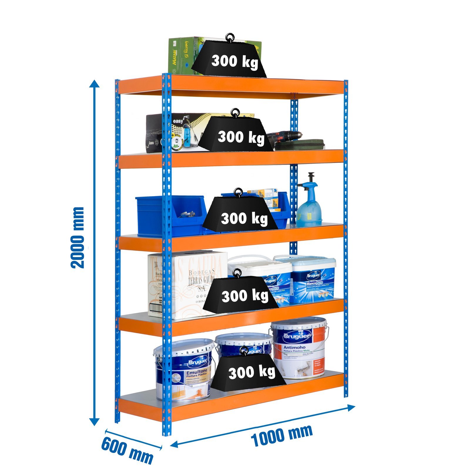 Estanteria metalica sin tornillos de color AZUL/NARANJA/GALVA con capacidad de carga por estante de 300 kg. El numero de estantes es 5 y las medidas (alto x ancho x fondo) son 2000x1000x600 mm. Incluye bandejas de metal. Producto europeo, calidad europea, podras encontrar las instrucciones de montaje en su interior. Medidas en uso del producto, 1975x1100x610 mm
