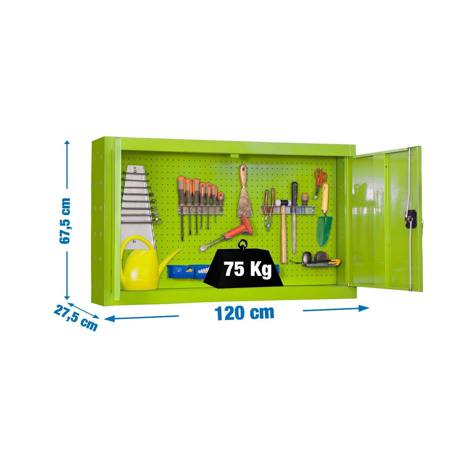 Armario metalico con cerradura para almacenar herramientas. Se puede anclar a la pared. Ideal para jardin. Dotado de un sistema de seguridad anti-volcado. Tiene una capacidad de carga de 75 kgs. No contiene aristas de corte, manipulacion sin riesgo. Con recubrimiento epoxi poliester antirayaduras e ignifugo. Producto fabricado en Espana por Simonrack. . Medidas en uso del producto, 675x1200x275 mm