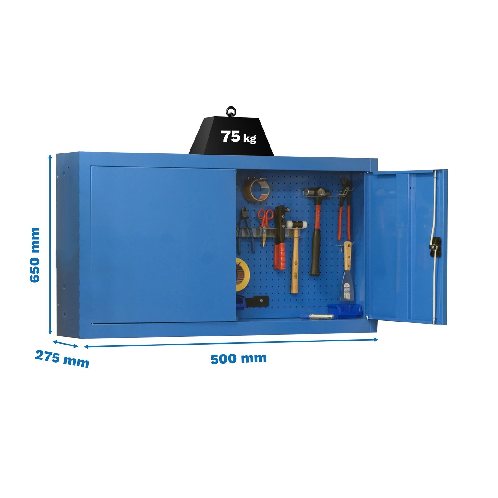 Armario metalico para herramientas. Dimensiones del armario (alto x ancho x fondo), 650x500x275 mm. Color, gris. Se entrega montado. Se puede anclar a la pared. No contiene aristas de corte, manipulacion sin riesgo. Con recubrimiento epoxi poliester antirayaduras e ignifugo. Producto fabricado en Espana por Simonrack