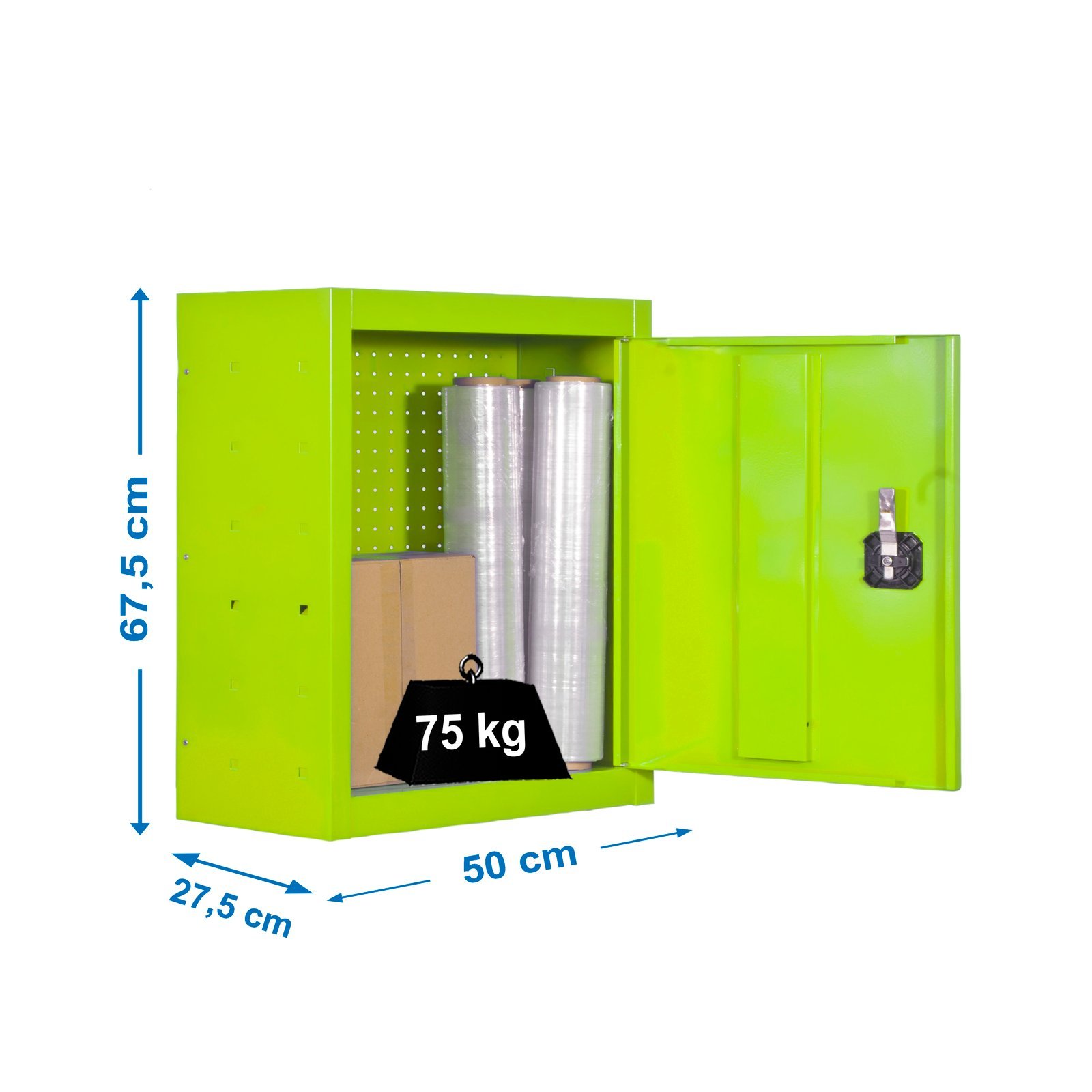 Armario metalico con cerradura para almacenar herramientas. Se puede anclar a la pared. Ideal para jardin. Dotado de un sistema de seguridad anti-volcado. Tiene una capacidad de carga de 75 kgs. No contiene aristas de corte, manipulacion sin riesgo. Con recubrimiento epoxi poliester antirayaduras e ignifugo. Producto fabricado en Espana por Simonrack. . Medidas en uso del producto, 675x500x275 mm