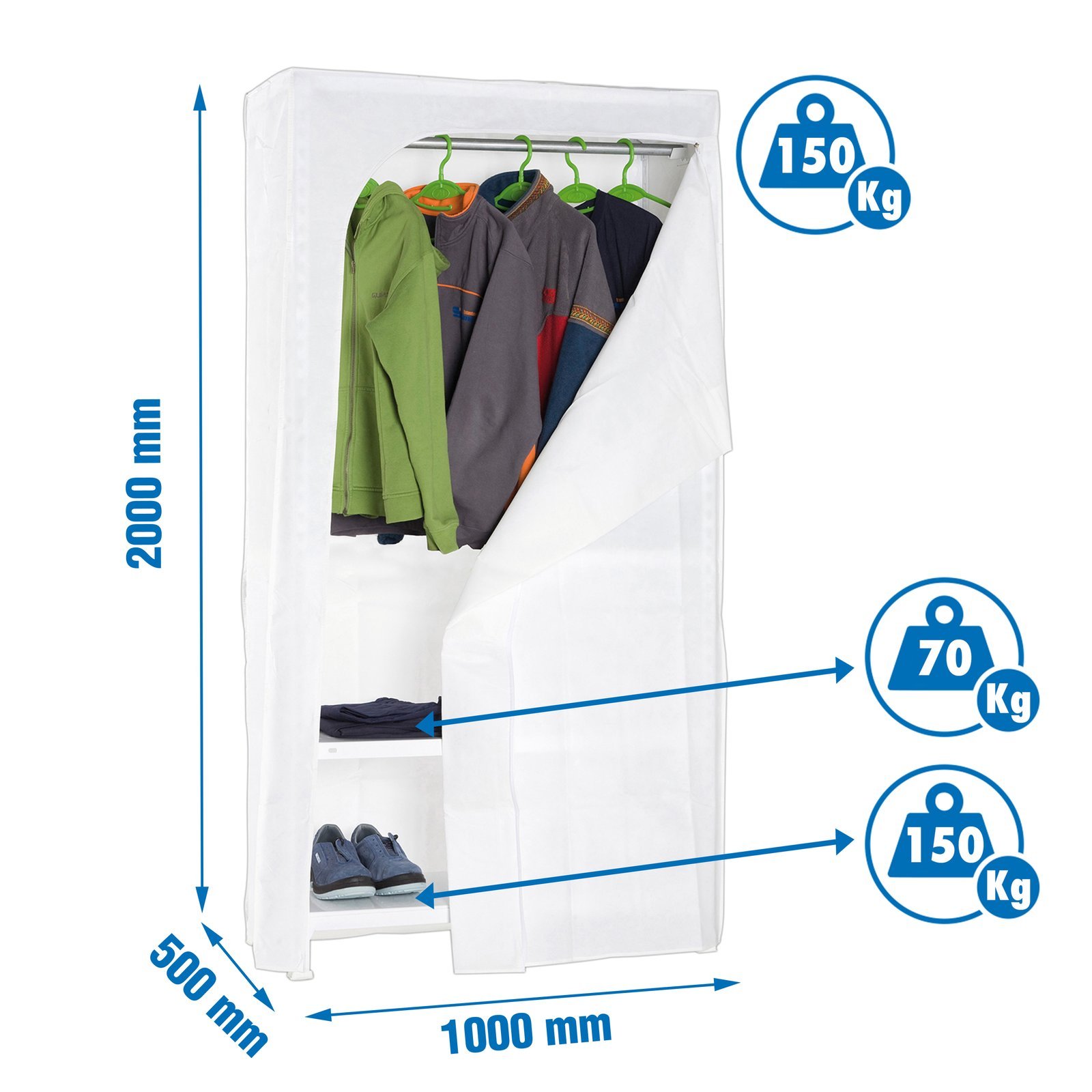 Estanteria metalica sin tornillos, de color BLANCO/BLANCO. Tiene 3 estantes. Contiene funda y barra colgadora. Las dimensiones de esta estanteria son, 2000x1000x500 mm. Tiene una capacidad de carga de 150-70 kgs. No se tambalea y no tiene aristas de corte. Es fabricado en Europa por Simonrack y se monta rapido siguiendo las instrucciones
