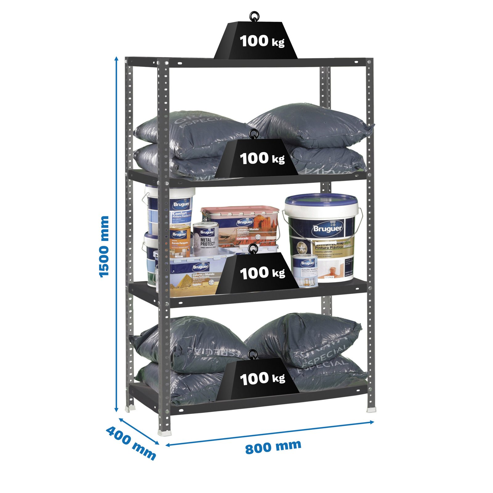 Estanteria metalica con tornillos, Comfort mini 4-400 de color ANTRACITA. Tiene 4 estantes. Estructura de color antracita y bandejas de metal. Las dimensiones de esta estanteria (alto x ancho x fondo) son, 1500x800x400 mm. Tiene una capacidad de carga de 100 kgs por estante, certificamos a punto de flexion, no de rotura. La ultima bandeja no debe superar los 10 cm de distancia con respecto al suelo. No se tambalea y no tiene aristas de corte. Estanteria Fabricada en Europa por Simonrack y se monta rapido siguiendo las instrucciones. Video de montaje, https, //www. youtube. com/watch?v=qmx57bCt7qc