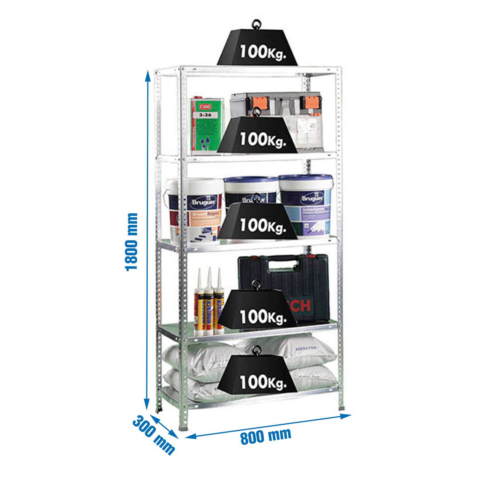 Estanteria metalica con tornillos de color GALVANIZADO con capacidad de carga por estante de 100 kg. El numero de estantes es 5 y las medidas (alto x ancho x fondo) son 1800x800x300 mm. La ultima bandeja no debe superar los 10 cm de distancia con respecto al suelo. Producto europeo, calidad europea, podras encontrar las instrucciones de montaje en su interior o en este enlace, https, //www. youtube. com/watch?v=qmx57bCt7qc. Medidas en uso del producto, 1800x810x310 mm