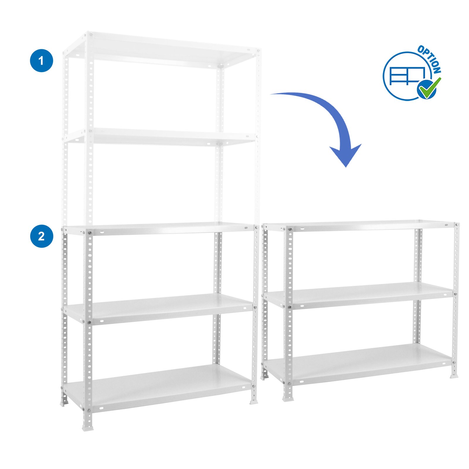 Estanteria metalica con tornillos de color BLANCO con capacidad de carga por estante de 100 kg. El numero de estantes es 5 y las medidas (alto x ancho x fondo) son 2000x1000x400 mm. La ultima bandeja no debe superar los 10 cm de distancia con respecto al suelo. Producto europeo, calidad europea, podras encontrar las instrucciones de montaje en su interior o en este enlace, https, //www. youtube. com/watch?v=qmx57bCt7qc. Medidas en uso del producto, 2000x1100x410 mm