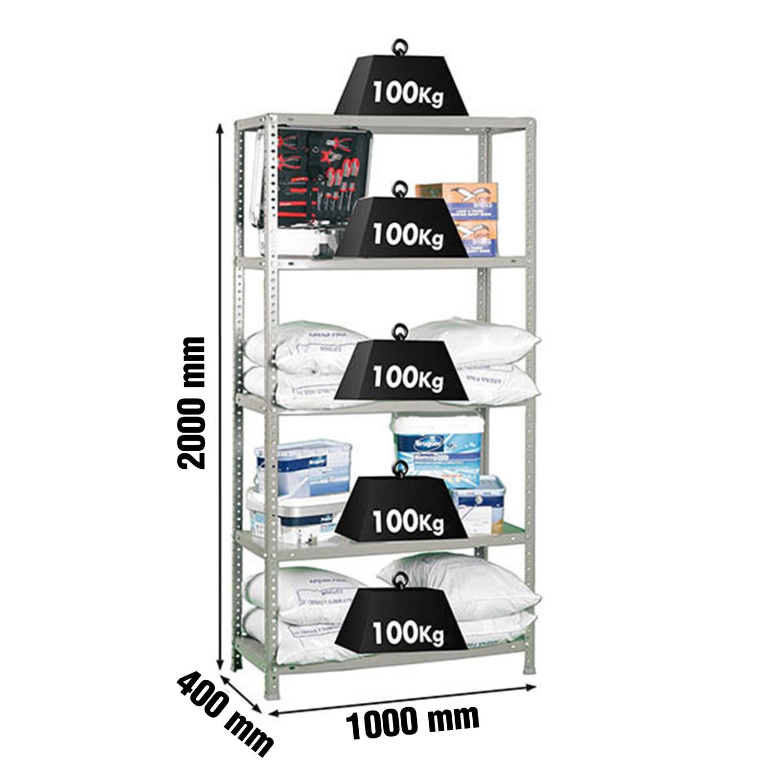 Estanteria metalica con tornillos de color GRIS con capacidad de carga por estante de 100 kg. El numero de estantes es 5 y las medidas (alto x ancho x fondo) son 2000x1000x400 mm. La ultima bandeja no debe superar los 10 cm de distancia con respecto al suelo. Producto europeo, calidad europea, podras encontrar las instrucciones de montaje en su interior o en este enlace, https, //www. youtube. com/watch?v=qmx57bCt7qc. Medidas en uso del producto, 2000x1100x410 mm