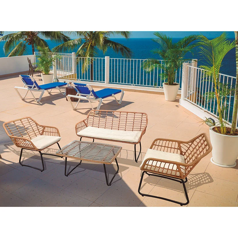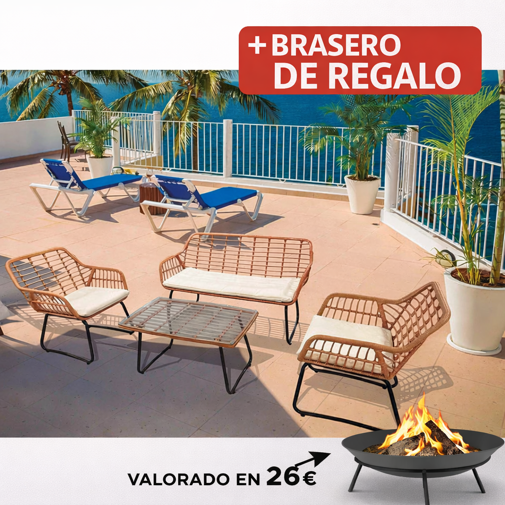 Conj Ratán SofÁ+2 Sillones+mesa Baja 119x69x85 Cm 67x69x85 Cm Mueble Fibra + Brasero Exterior De Regalo