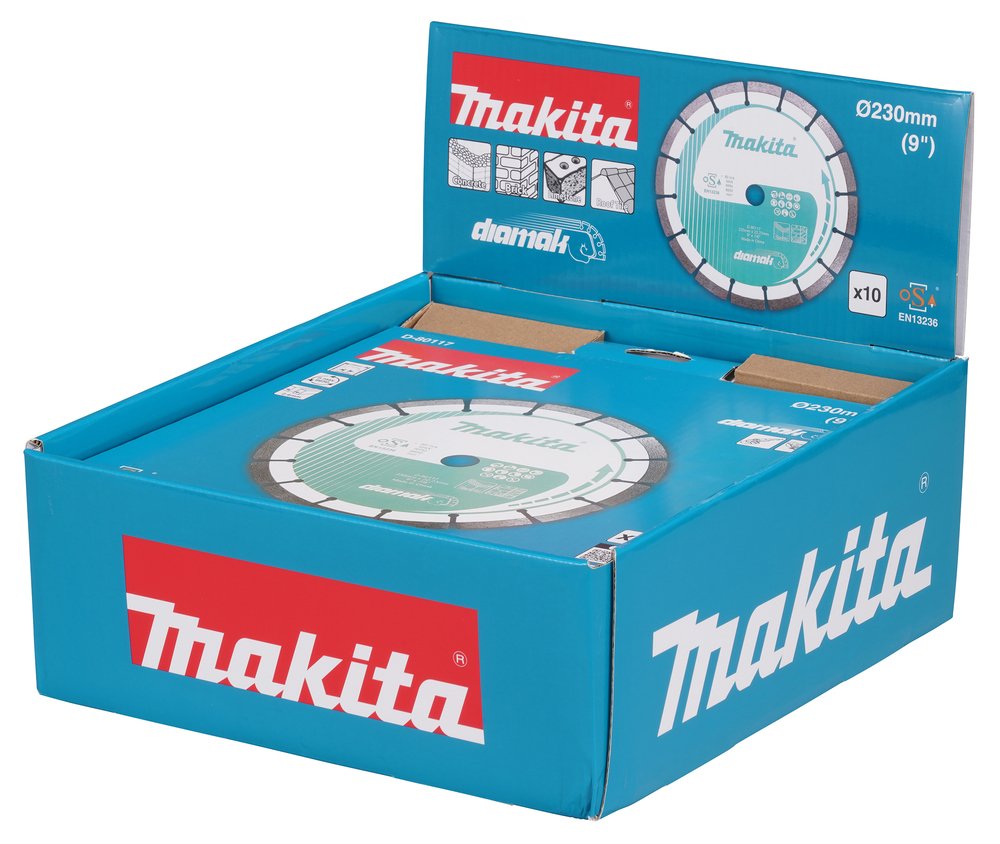 Discos de diamante Diamak de 230 mm para corte de materiales universales.DescripciónDiscos de diamante Diamak de 230 mm de diámetro para corte en seco y húmedo de materiales universales como hormigón, ladrillo, baldosas y piedra caliza. El disco es de tipo segmentado, con una altura del segmento de 10 mm y un diámetro interior de 22,23 mm. Compatible con amoladoras y cortadoras eléctricas de 230 mm.Especificaciones técnicasDiámetro: 230 mmTamaño del orificio (diámetro del orificio): 22,23 mmAltura del segmento: 10 mmCantidad: 10Otras características relevantesAmoladora angular 2