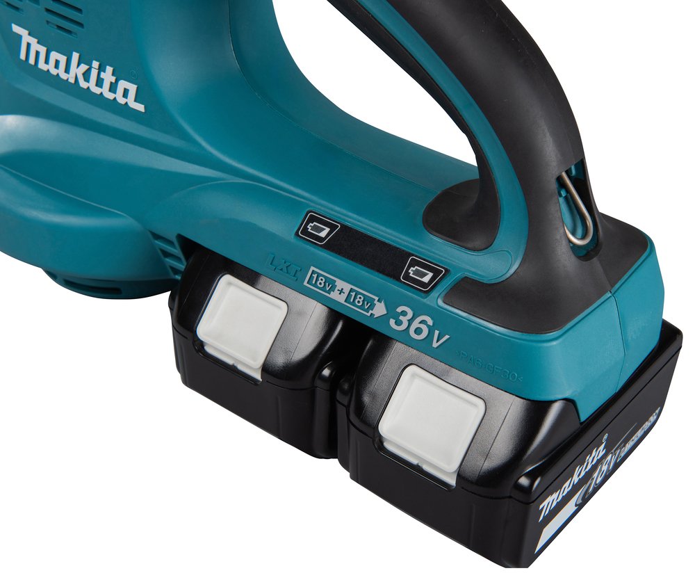 18V X2 • 93 m/s • 4, 4 m³/min Soplador eficiente y compacto para un uso exigenteDescripciónUn versátil soplador silencioso y extremadamente eficiente para construcción y jardinería. Dos baterías LXT® de 18V logran un alto voltaje de 36V. Dos velocidades de flujo de aire. sólo herramienta, batería y cargador no incluidos. Beneficios del usuarioBajo nivel sonoro adecuado para su uso en zonas residenciales y espacios públicosBoquilla de soplado larga con punta curvada para un rendimiento de soplado óptimoEl sistema de protección de la batería corta automáticamente la alimentación cuando el nivel de la batería es bajoRendimiento de 36 V a partir de dos baterías de 18 V conectadas en serie. Las baterías se colocan en paralelo en estaciones de acoplamiento independientes. Especificaciones técnicasTensión LXT, 1Tensión nominal de la batería, 2×18 VQuímica de la batería (Ni-Cd / Ni-MH / Li-ion), Li-ionVelocidad sin carga, 10000 / 17000 min⁻¹Max. Velocidad del aire, 93 m/sVolumen de aire, 2, 6 / 4, 4 m³/minUso continuo 18V / 3, 0 Ah x2, 51 / 17 minUso continuo 18V / 4, 0 Ah x2, 73 / 24 minNivel de potencia sonora (LWA), 95, 7 dB(A)Nivel de presión sonora (LpA), 87, 8 dB(A)Peso neto del producto, 1, 9 kgIncertidumbre del ruido (Factor K), 3 dB(A)Peso de la herramienta con batería, 2, 6 – 3, 2 kgDimensiones de producto (L x W x H), 905x141x194 mmNivel de vibración, funcionamiento sin carga, ≤ 2, 5 m/s²Incertidumbre de vibración (Factor K), funcionamiento sin carga, 1, 5 m/s²Otras características relevantes2 velocidades eléctricas18V+18V=36V LXT Litio-Ion Tecnología de protección extrema XPTEquipo básico452123-4, Boquilla larga