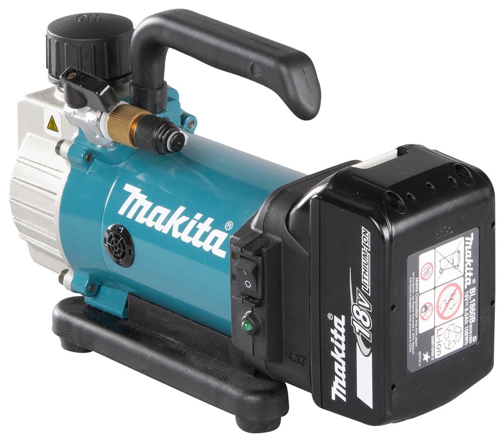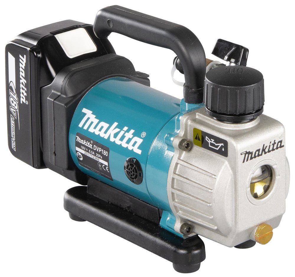 18V • 50 l/Min Bomba de vacío para instaladores de bombas de calor y sistemas de refrigeraciónDescripciónUna bomba de vacío sin cables para purgar fácilmente el aire durante la instalación de unidades de aire acondicionado. Debido a su pequeño tamaño, la bomba es fácilmente transportable. Su tiempo de funcionamiento con una batería de 5, 0Ah es de hasta 50 minutos. Sin batería, sin cargador en equipo básico. Beneficios del usuarioDiseño compacto y ligeroEl orificio de drenaje con válvula permite sustituir fácilmente la bomba de aceite de vacíoEl sistema de protección de la batería corta automáticamente la alimentación cuando el nivel de la batería es bajoEspecificaciones técnicasTensión LXT, 1Tensión nominal de la batería, 18 VVelocidad sin carga, 3840 min⁻¹Caudal máxima, 50 L/minBatería de uso continuo de 18 V / 5, 0 Ah, 50 minPeso neto del producto, 2, 9 kgPeso de la herramienta con batería, 2, 9 – 3, 5 kgDimensiones de producto (L x W x H), 265x93x175 mmNivel de vibración (3 ejes), ≤ 2, 5 m/s²Tamaño de rosca, 5/16″, 1/4″Aceite, 115 mlOtras características relevantesLXT Litio-IonEquipo básicoAS00VP050M, Aceite bomba vacío 150 mlAS0Y06110K, Adaptador
