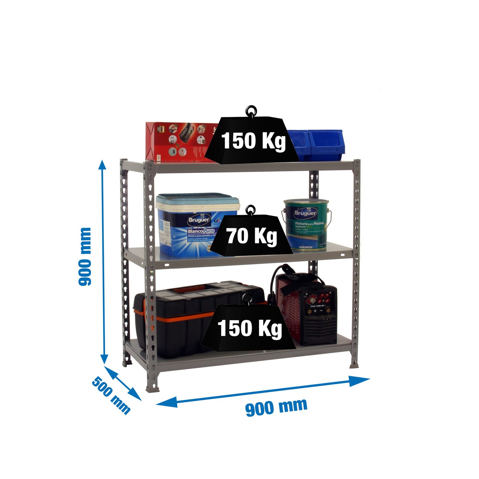 Estanteria metalica sin tornillos, de color GRIS. Tiene 3 estantes. Las dimensiones de esta estanteria son, 900x900x500 mm. Y tiene una capacidad de carga de 70 kgs el estante intermedio y 150 kgs los estantes superior e inferior. Es fabricado en Europa por Simonrack y se monta rapido siguiendo las instrucciones