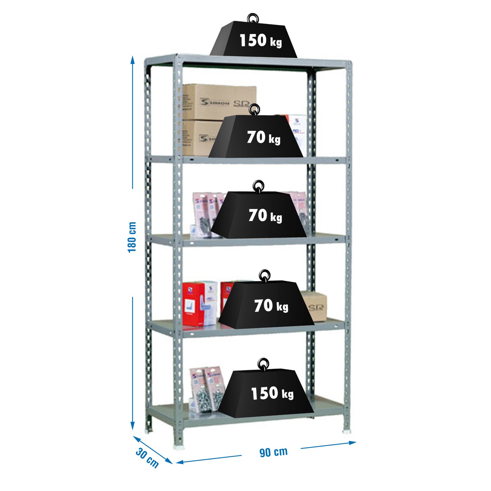 Estanteria metalica sin tornillos. Color, GRIS. Tiene 5 estantes. Dimensiones, 1800x900x300 mm. Capacidad de carga, 150 kgs los estantes superior e inferior y 70 kgs los estantes intermedios, certificamos a punto de flexion, no de rotura. No se tambalea, no tiene aristas de corte. fabricado en Europa por Simonrack y se monta rapido siguiendo las instrucciones