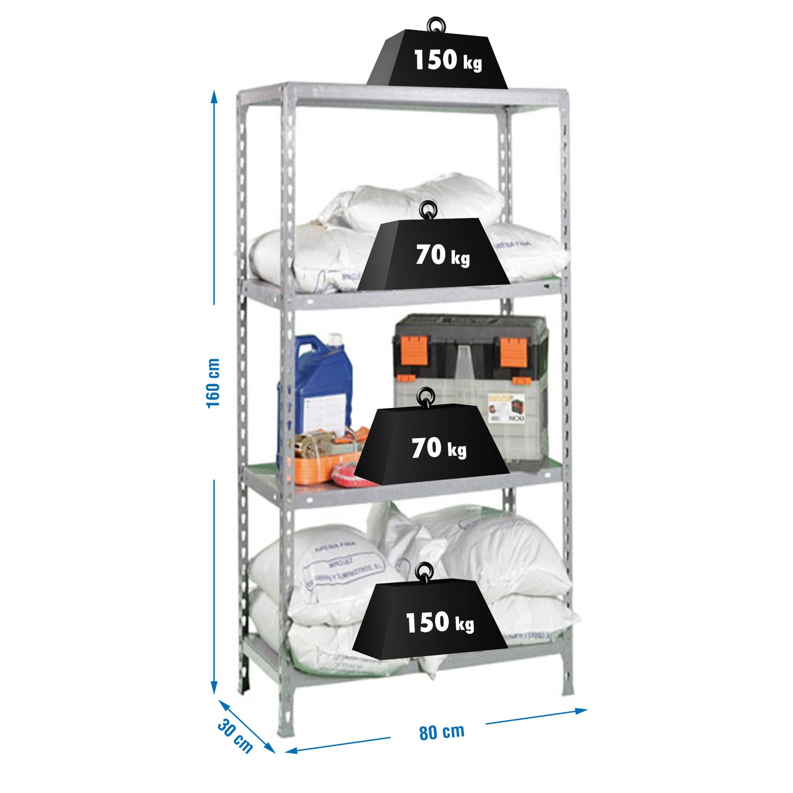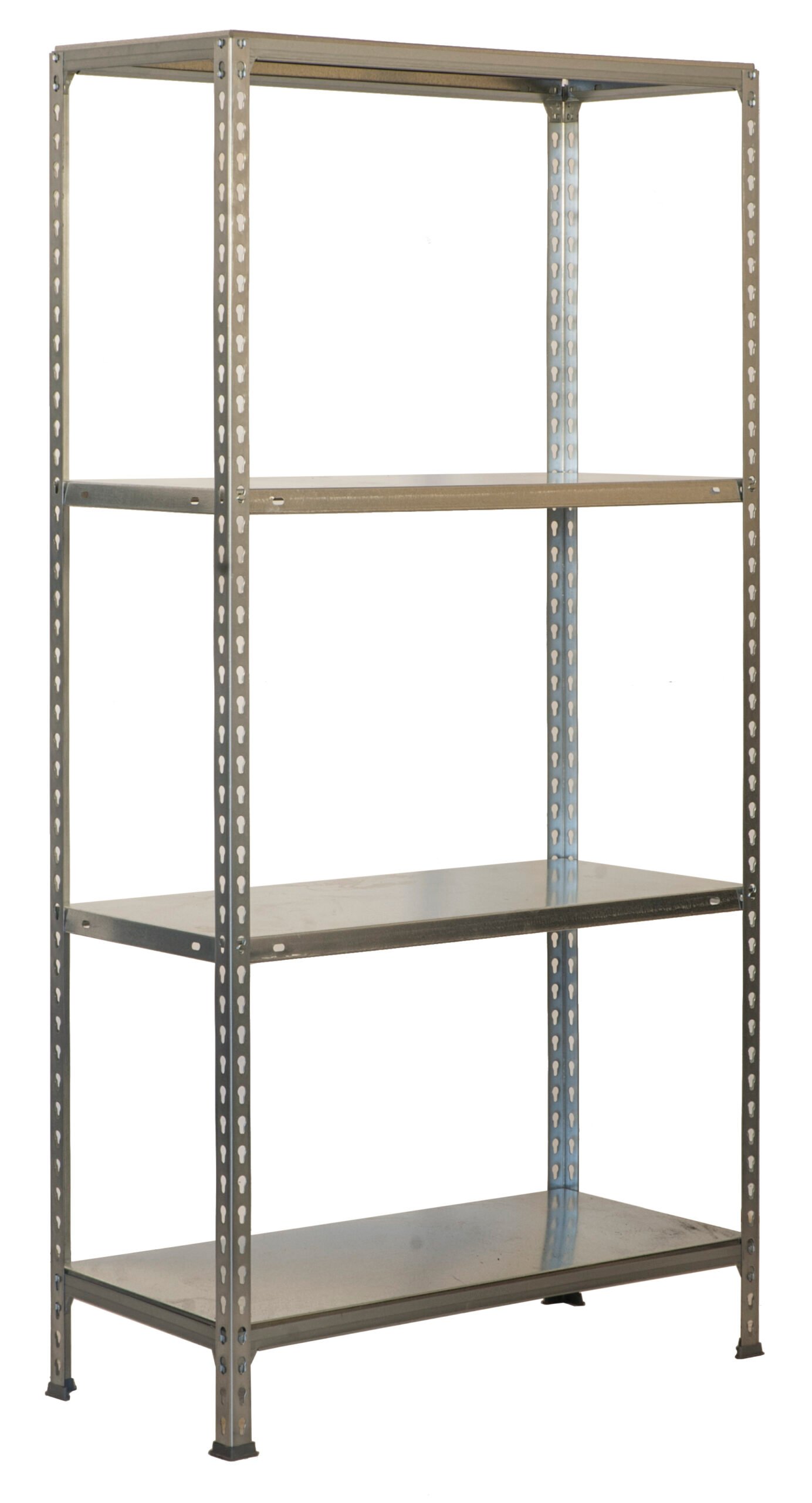 Estanteria metalica sin tornillos. Color, GALVANIZADO. Tiene 4 estantes. Dimensiones, 1600x800x300 mm. Capacidad de carga, 150 kgs los estantes superior e inferior y 70 kgs los estantes intermedios, certificamos a punto de flexion, no de rotura. No se tambalea, no tiene aristas de corte. fabricado en Europa por Simonrack y se monta rapido siguiendo las instrucciones