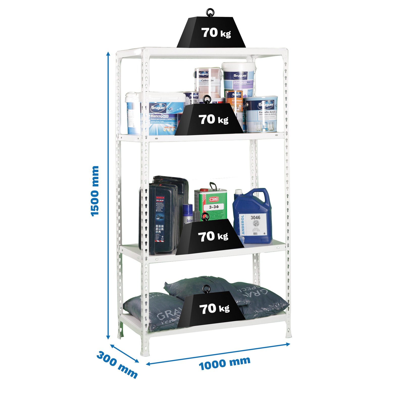 Estanteria metalica sin tornillos, de color BLANCO. Tiene 4 estantes. Las dimensiones de esta estanteria son, 1500x1000x300 mm. Y tiene una capacidad de carga de 70 kgs los estantes intermedios y 150 kgs los estantes superior e inferior. Es fabricado en Europa por Simonrack y se monta rapido siguiendo las instrucciones