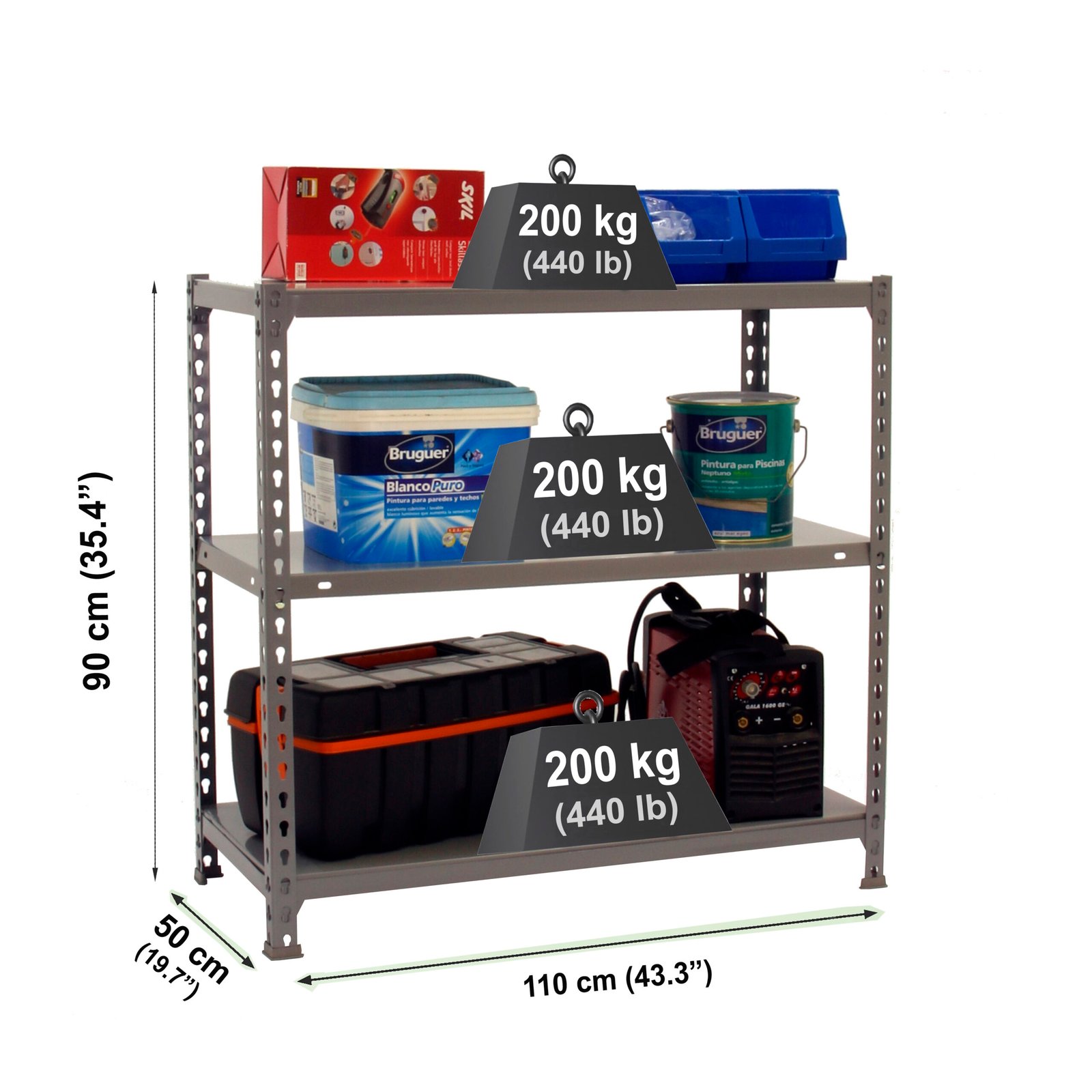Estanteria metalica sin tornillos, de color GRIS. Tiene 3 estantes. Las dimensiones de esta estanteria son, 900x1100x500 mm. Y tiene una capacidad de carga de 60 kgs el estante intermedio y 150 kgs los estantes superior e inferior. Es fabricado en Europa por Simonrack y se monta rapido siguiendo las instrucciones