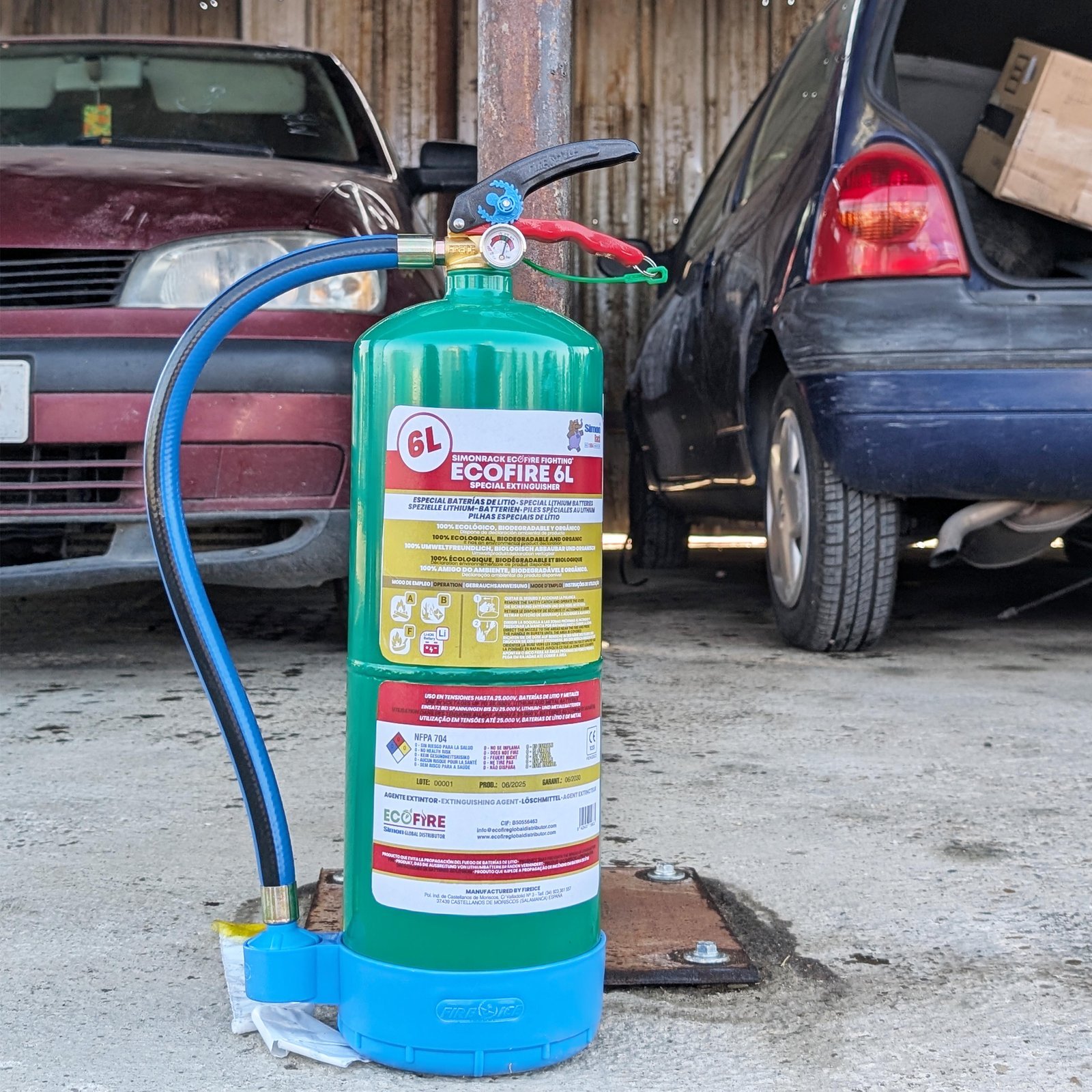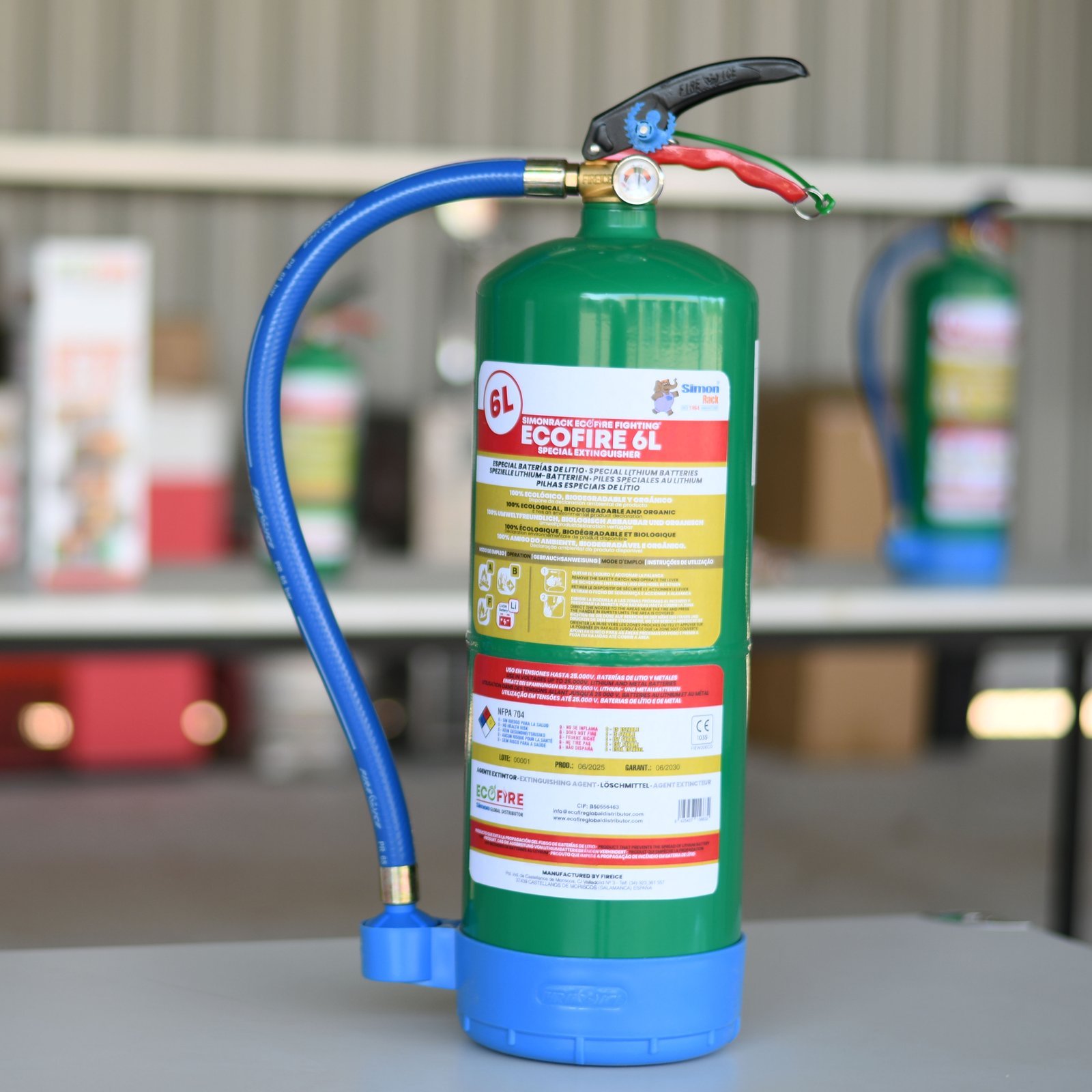 Equipo de proteccion contra incendios 6 litros ECOFIRE FIGHTING. Maxima potencia. Eficiencia ecologica. Diseñado para protegerte en situaciones extremas, este producto de 6 litros esta cargado con el exclusivo liquido contra incendios Ecofire Fighting Special Extinguisher, una formula 100% ecologica, biodegradable, organica y no toxica. Encapsula el humo al instante, no daña a personas, animales ni plantas y convierte de forma permanente en ignifugo todo lo que recubre. A diferencia de los retardantes comunes, este producto bloquea el fuego por completo, actua como una autentica barrera cortafuegos, impidiendo la reactivacion del incendio una vez extinguido. Su accion comienza al alcanzar los 90-95°C, generando una capa carboxilica que se expande hasta 50 veces el tamaño del recubrimiento, aislando el oxigeno y cortando la combustion. Ventajas clave, extincion total sin reactivacion. Incluye soporte metálico para la pared. No transmite calor. Se limpia con agua y no deja residuos. Eficacia 30-40 veces superior al agua. Riesgo practicamente nulo para usuarios y personal de emergencia. Tan sostenible que incluso te lo puedes beber. Caracteristicas tecnicas, Capacidad, 6 litros. Garantia, 3 años para el envase / 5 años para el liquido. Apto para fuegos de tipo A (materiales solidos), B (liquidos/gases), L (electricos/metales) y F (grasas/aceites). Temperatura de servicio, desde -30°C. Presion de servicio a 20°C, 17, 5 bar. Ensayo certificado dielectrico hasta 25. 000 V. Declaracion ambiental de producto. Producto inventado en Europa y distribuido por Ecofire Simon Global Distributor. Modo de uso, 1- retira el seguro. 2- apunta a la base del fuego. 3-Presiona la maneta. 4-Realiza movimientos de barrido de lado a lado (a rafagas). Mantenimiento sencillo, verifica la presion con el manometro integrado. Si la presion se mantiene, no es necesaria asistencia profesional. Se debe recargar tras cada uso, incluso si fue parcial, usando siempre piezas y recargas homologadas. Retimbrado obligatorio cada 5 años. Ideal para, coches electricos, patinetes, cocinas, enchufes y espacios de dificil evacuacion