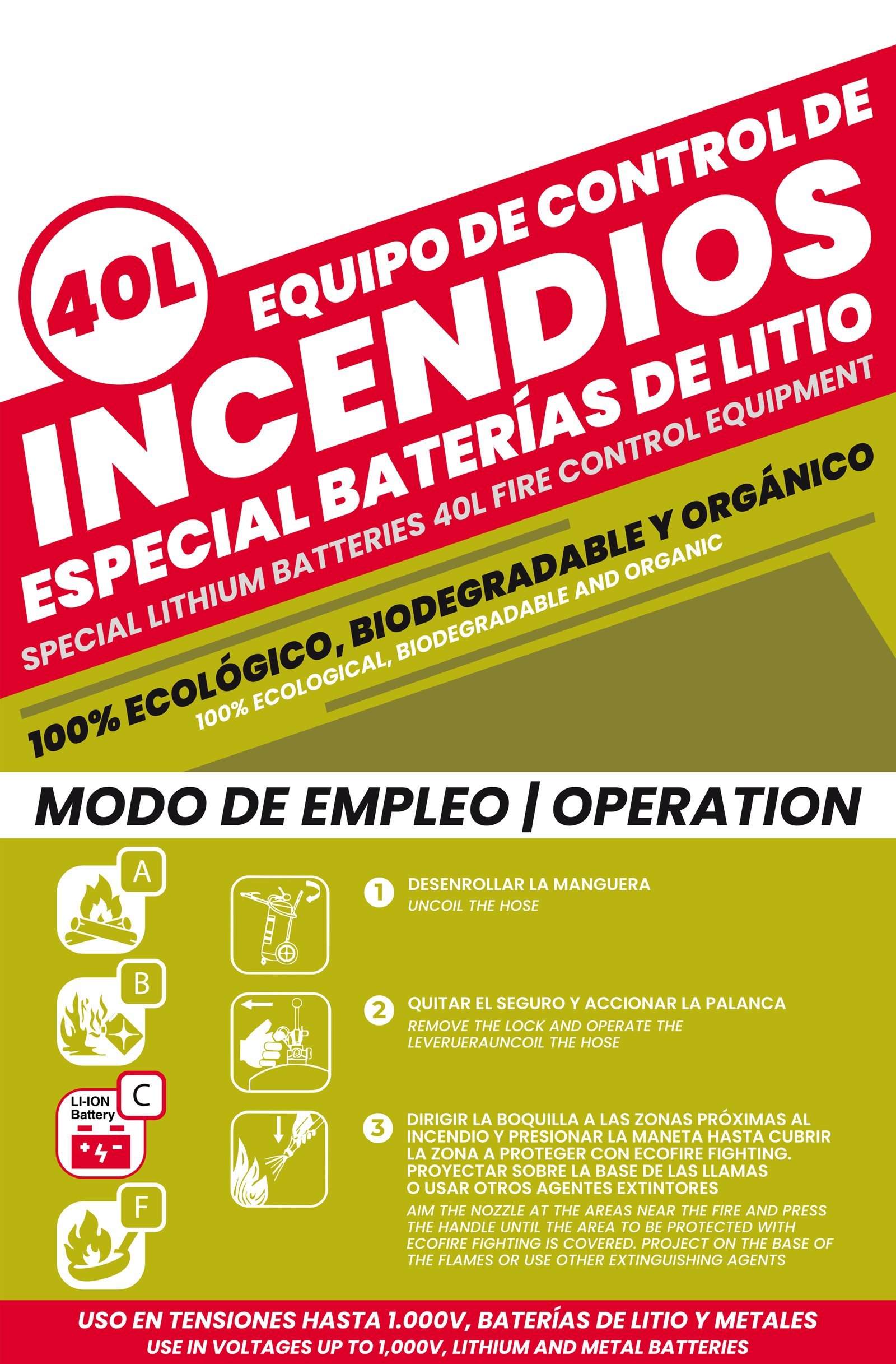 Equipo de proteccion contra incendios con capacidad de 40 litros de Simonrack Ecofire Fighting. Con un peso bruto de 81, 96 kg y unas dimensiones (alto x ancho x fondo) de 1. 130x560x450 mm. Es facil de transportar y constituye la mejor alternativa a los extintores convencionales, ya que estos son retardantes del fuego, mientras que SEF actua como bloqueante y encapsula el humo, impidiendo la emision de cualquier gas toxico. Evita la transmision del calor y la propagacion del incendio. Evita la reignicion. Gran capacidad de extincion de baterias de litio por inmersion, no reacciona con el litio. Gran capacidad de extincion de fuegos generados por grasas y aceites. Apto para fuegos de metales (TIPO D). Pieza clave en la estrategia de prevencion de incendios y riesgos de todas las instituciones, centros, empresas donde haya puntos de carga de coche electrico, empresas que se dediquen al transporte o almacenaje de dispositivos electricos, veanse patinetes, carretillas o vehiculos electricos