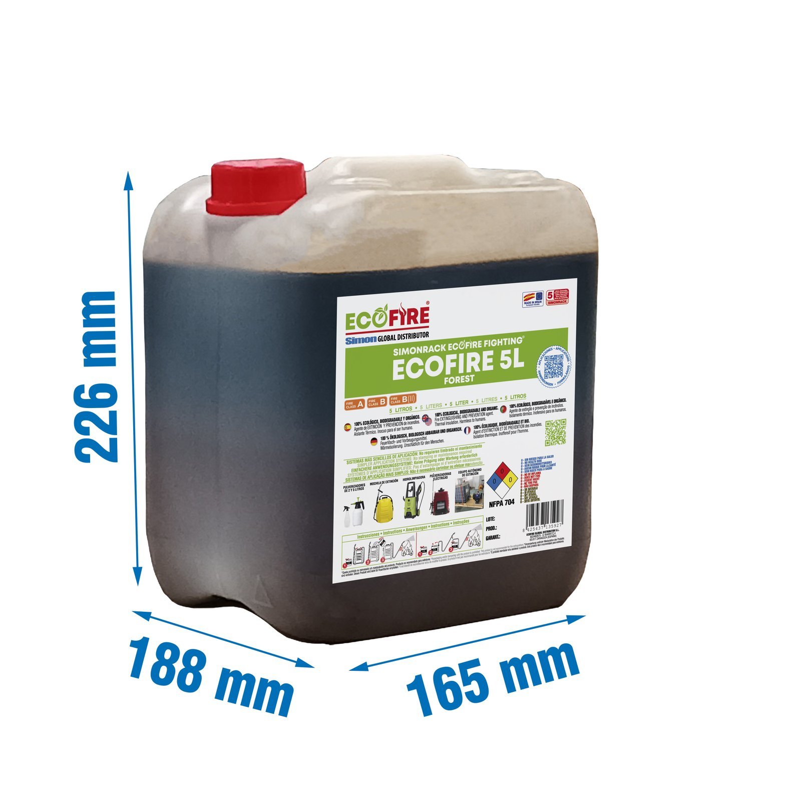 Ecofire forest en envase de 5 litros. Recomendado para extincion de incendios de grandes superficies. Su menor densidad favorece su dispersion homogenea. 100% ecologico, biodegradable y organico. Agente de extincion y prevencion de incendios, inocuo para el ser humano, plantas y animales. Actua como aislante termico, no transmite el calor. Sistemas sencillos de aplicacion como pulverizadores, mochila de extincion o un equipo autonomo de extincion. Barrera preventiva contra el fuego, actua como cortafuegos. Extincion total del fuego, no se vuelve a reactivar una vez apagado. Corta el humo de forma inmediata, evitando intoxicacion. Evita la propagacion del fuego, perfecto ante cambios climatologicos y vientos. Entre 50 y 100 veces mas rapido que el agua. Se necesita poca cantidad para extinguir el fuego, 1 litro de Ecofire equivale a 20 litros de agua
