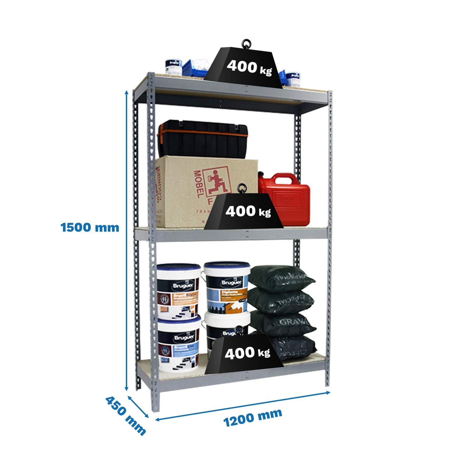 Estanteria metalica media carga de color gris/madera con 3 alturas. Tiene una capacidad de carga por estante de 400 kg y una capacidad total de 1200 kgs. Con unas medidas en mm de 1500x1200x450. Incluye 3 bandejas de aglomerado. Fabricada en Europa por Simonrack y se monta rapido siguiendo las instrucciones