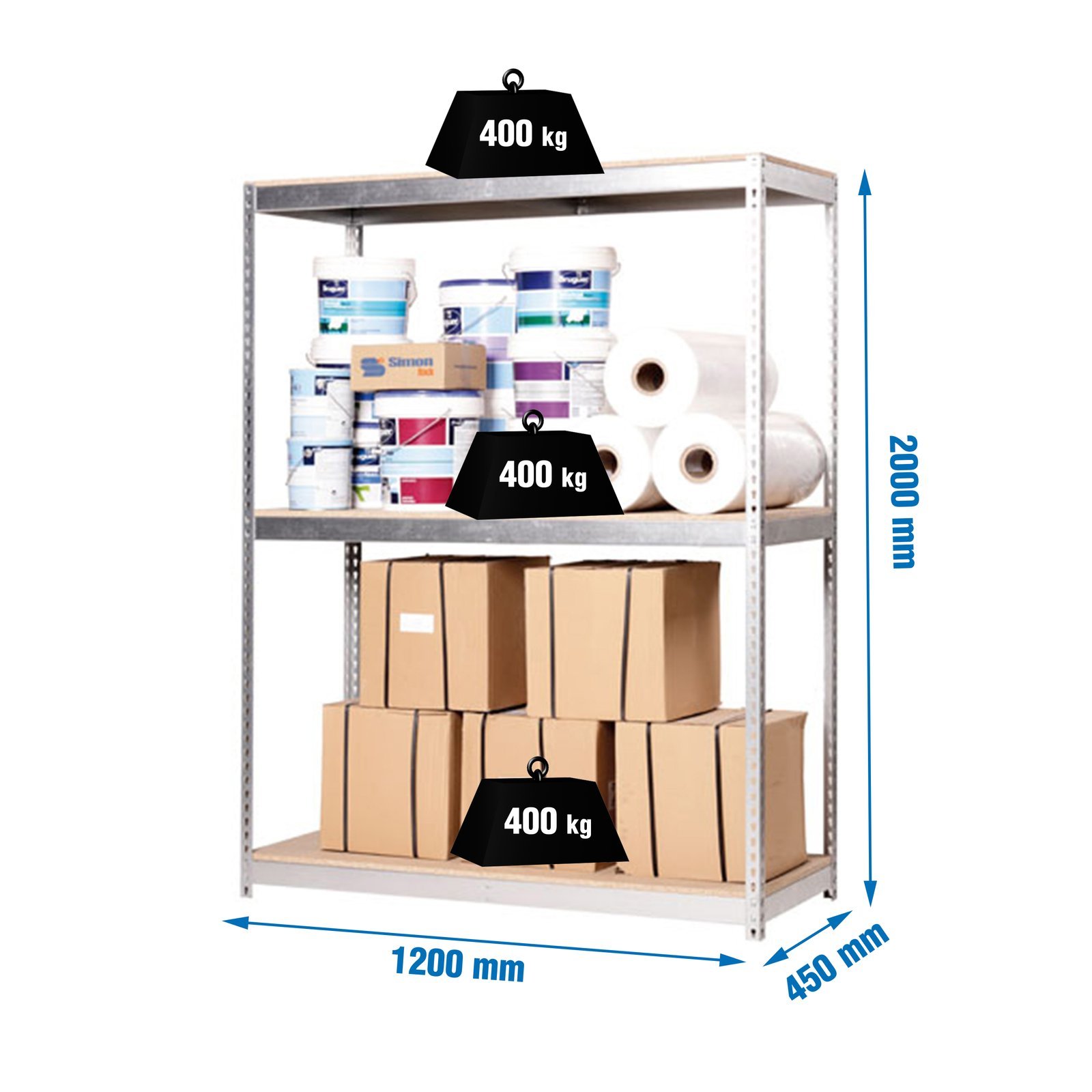 Estanteria metalica sin tornillos con 3 estantes. No contiene ni bandejas de aglomerado ni bandejas de metal. Estanteria que se monta de forma facil y comoda gracias a su sistema de click, sin tornillos simplemente con la ayuda de un martillo podras tener esta estanteria montada en unos minutos. Tienes a tu disposicion un video detallado de montaje en Youtube. La capacidad de carga de cada uno de los estantes es de 400 kgs. No contiene refuerzos. Contiene un recubrimiento plastico y acaaseo en epoxypoliester. Ademas es muy facil de limpiar. Manipulacion del producto sin aristas de corte, sin riesgos de manipulacion. Es un producto fabricado en Europa por Simonrack. Medidas en uso del producto, 1975x1210x460 mm