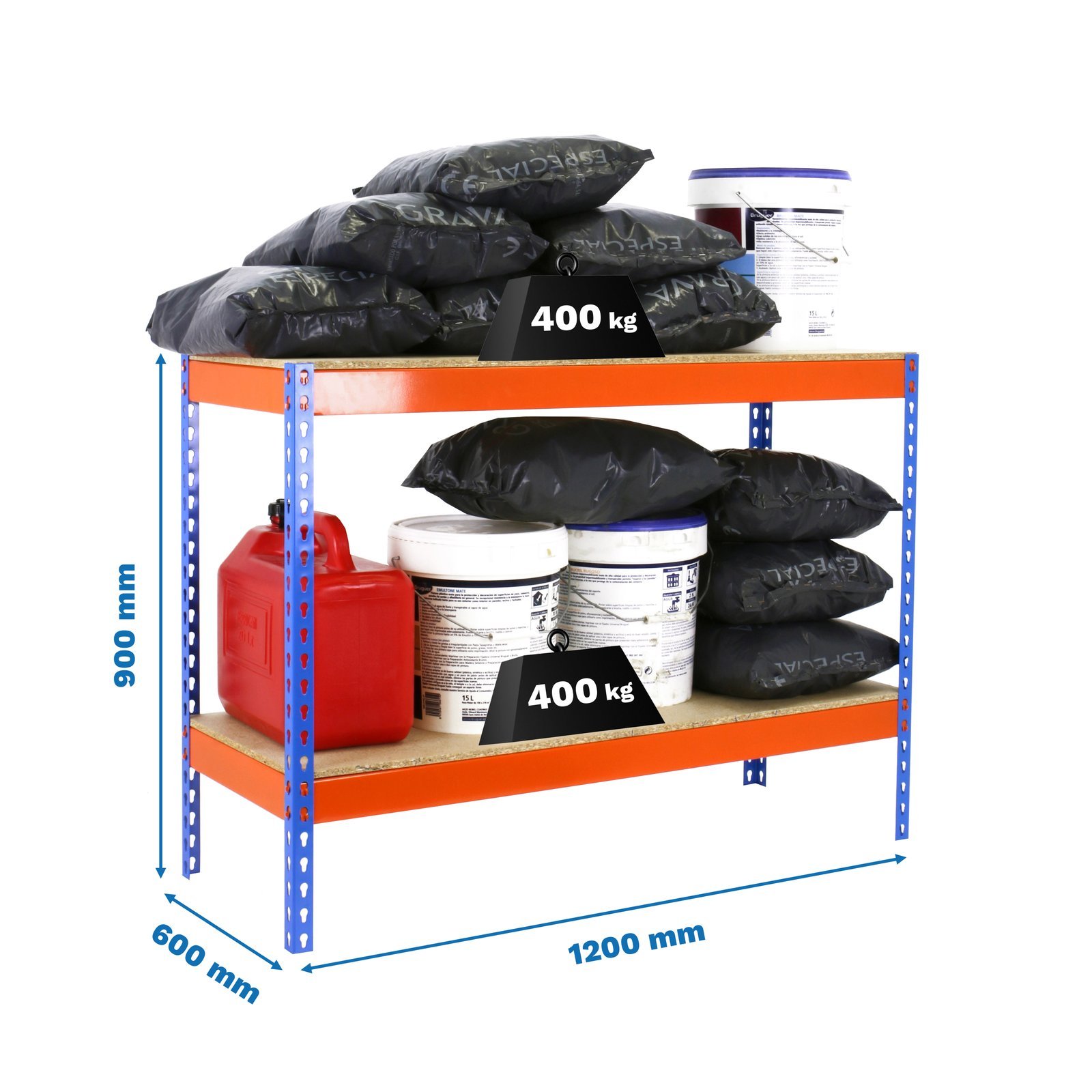 Estanteria metalica media carga de color azul/naranja/madera con 2 alturas. Tiene una capacidad de carga por estante de 400 kg y una capacidad total de 800 kgs. Con unas medidas en mm de 900x1200x600. Incluye 2 bandejas de aglomerado. Fabricada en Europa por Simonrack y se monta rapido siguiendo las instrucciones