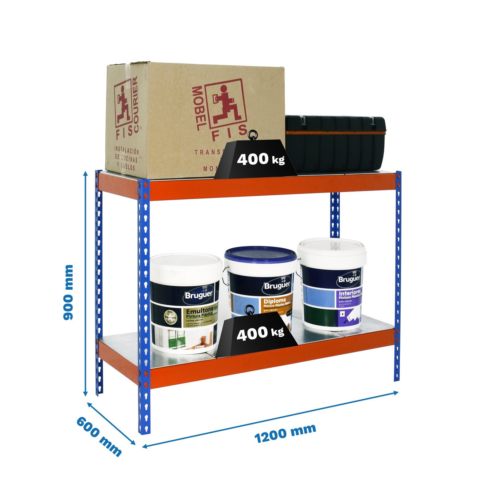 Estanteria metalica media carga de color azul/naranja/galva con 2 estantes. Tiene una capacidad de carga por estante de 400 kg y una capacidad total de 800 kgs. Con unas medidas en mm de 900x1200x600. Incluye bandejas de Metal. Fabricada en Europa por Simonrack y se monta rapido siguiendo las instrucciones