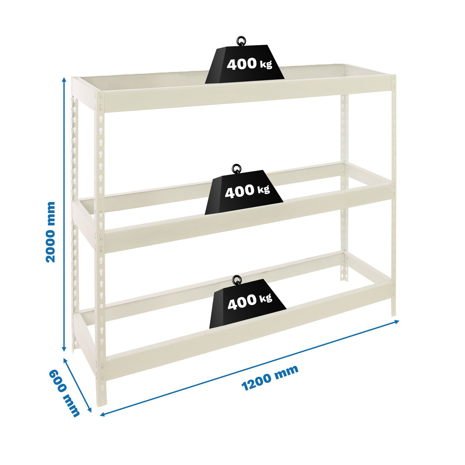 Estanteria metalica media carga de color blanco con 3 alturas. Tiene una capacidad de carga por estante de 400 kg y una capacidad total de 1200 kgs, carga certificada a punto de flexion, no de rotura. Con unas medidas en mm (alto x ancho x fondo) de 2000x1200x600. No incluye bandejas ni refuerzos. Fabricada en Europa por Simonrack y se monta rapido siguiendo las instrucciones. Sistema de montaje facil y rapido sin tornillos. Con recubrimiento epoxi poliester antirayaduras e ignifugo. No se tambalea. No contiene aristas de corte, manipulacion sin riesgo