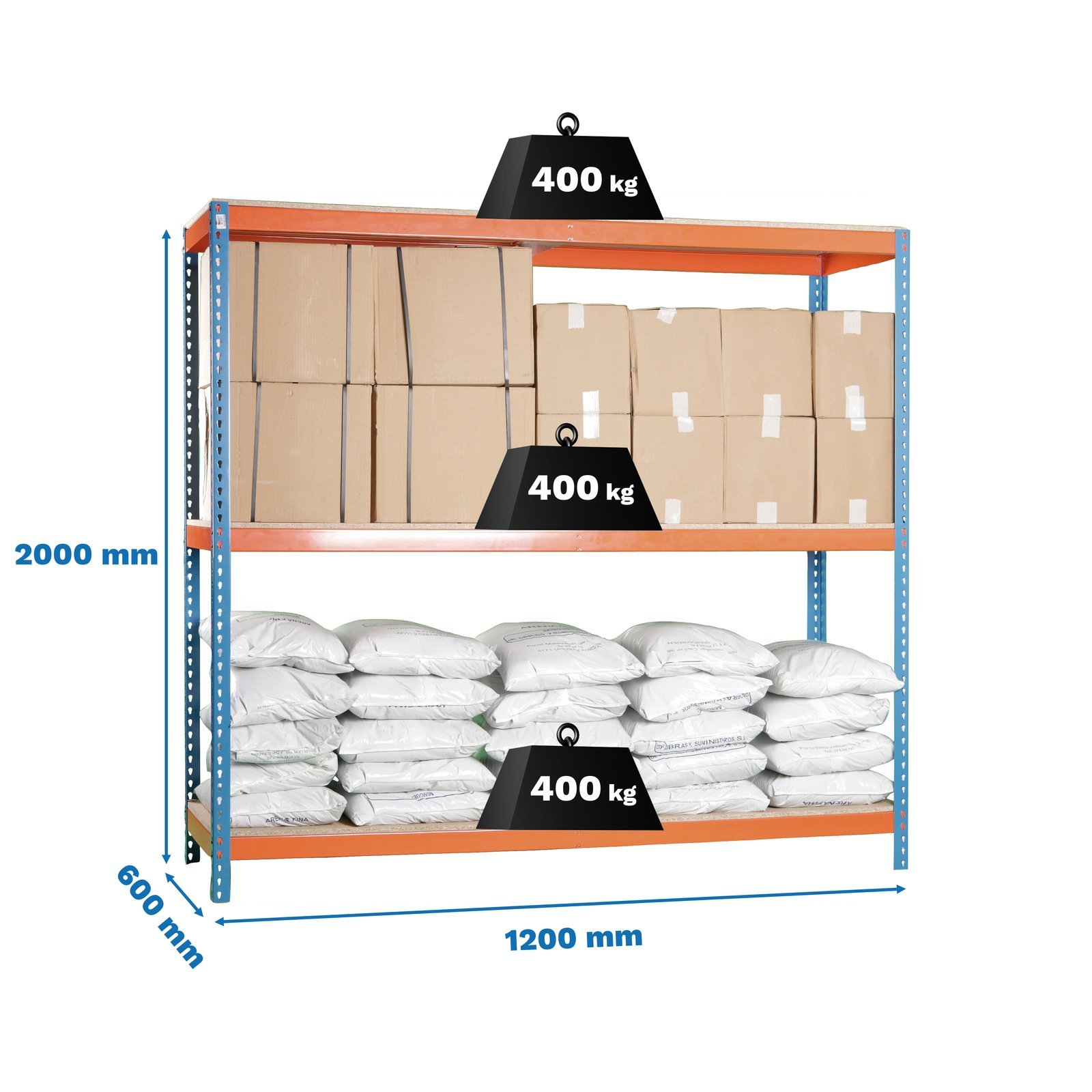 Estanteria metalica sin tornillos de color AZUL/NARANJA/MADERA con capacidad de carga por estante de 400 kg. El numero de alturas es 3, contiene 3 bandejas de aglomerado y las medidas (alto x ancho x fondo) son 2000x1200x600 mm. Producto europeo, calidad europea, podras encontrar las intrucciones de montaje en su interior o en este enlace, https, //www. youtube. com/watch?v=4HO6NqZuG-s. Medidas en uso del producto, 1975x1210x610 mm