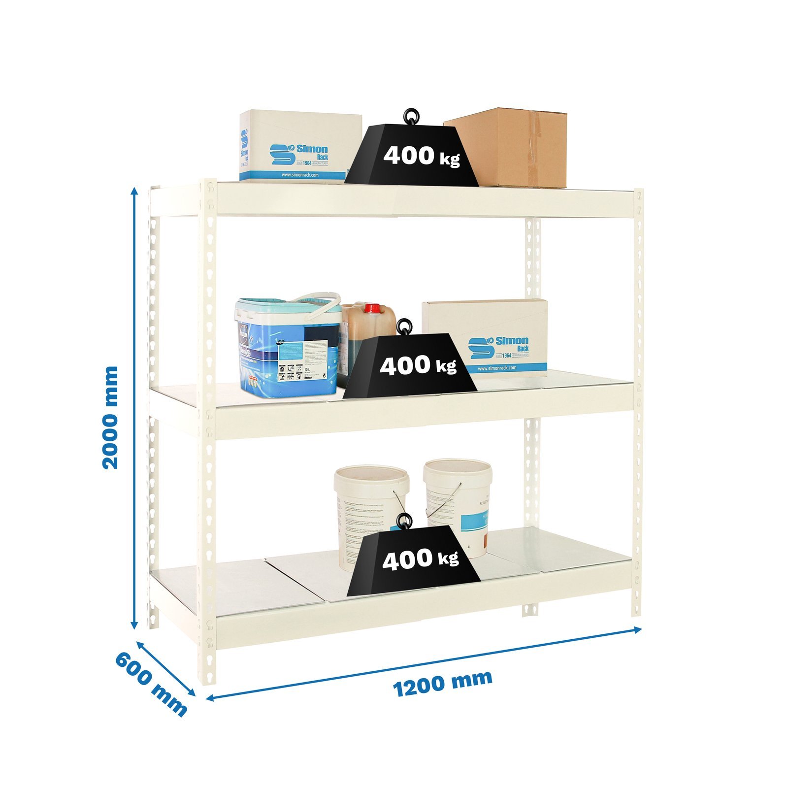 Estanteria metalica media carga de color blanco/galva con 3 alturas. Tiene una capacidad de carga por estante de 400 kg y una capacidad total de 1200 kgs, carga certificada a punto de flexion, no de rotura. Con unas medidas en mm (alto x ancho x fondo) de 2000x1200x600. Incluye bandejas de metal. Fabricada en Europa por Simonrack y se monta rapido siguiendo las instrucciones. Sistema de montaje facil y rapido sin tornillos. Con recubrimiento epoxi poliester antirayaduras e ignifugo. No se tambalea. No contiene aristas de corte, manipulacion sin riesgo