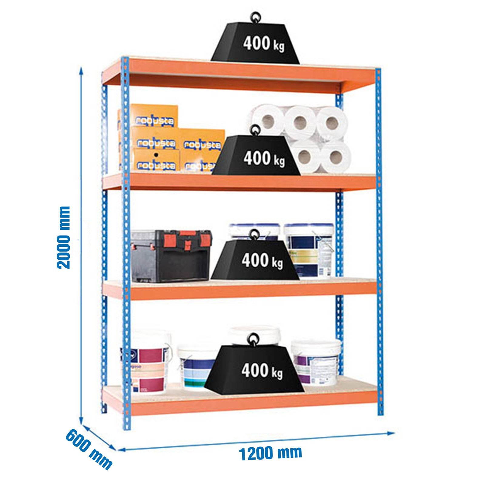 Estanteria metalica sin tornillos de color AZUL/NARANJA/MADERA con capacidad de carga por estante de 400 kg. El numero de alturas es 4, contiene 4 bandejas de aglomerado y las medidas (alto x ancho x fondo) son 2000x1200x600 mm. Producto europeo, calidad europea, podras encontrar las intrucciones de montaje en su interior o en este enlace, https, //www. youtube. com/watch?v=4HO6NqZuG-s. Medidas en uso del producto, 1975x1210x610 mm