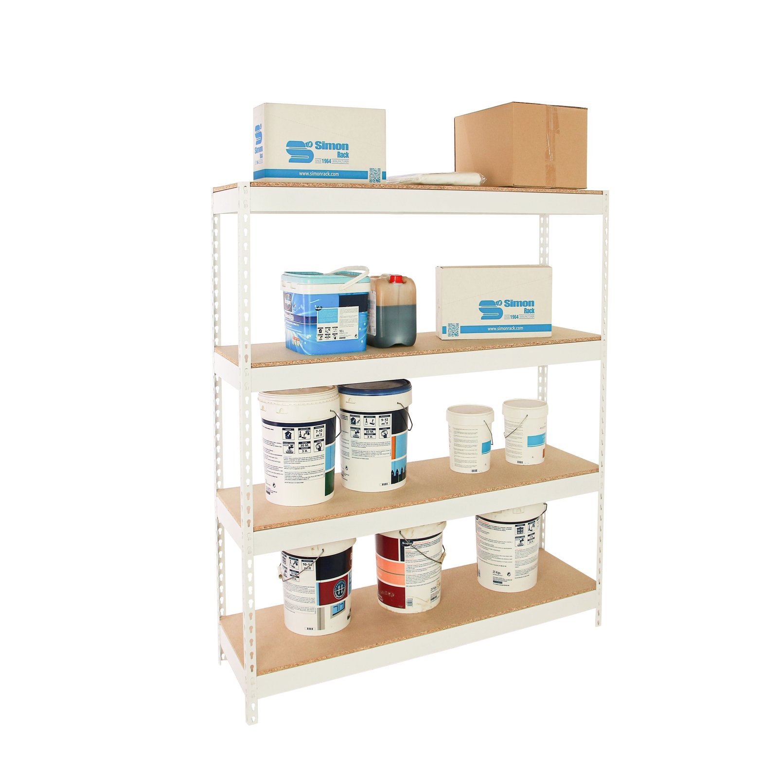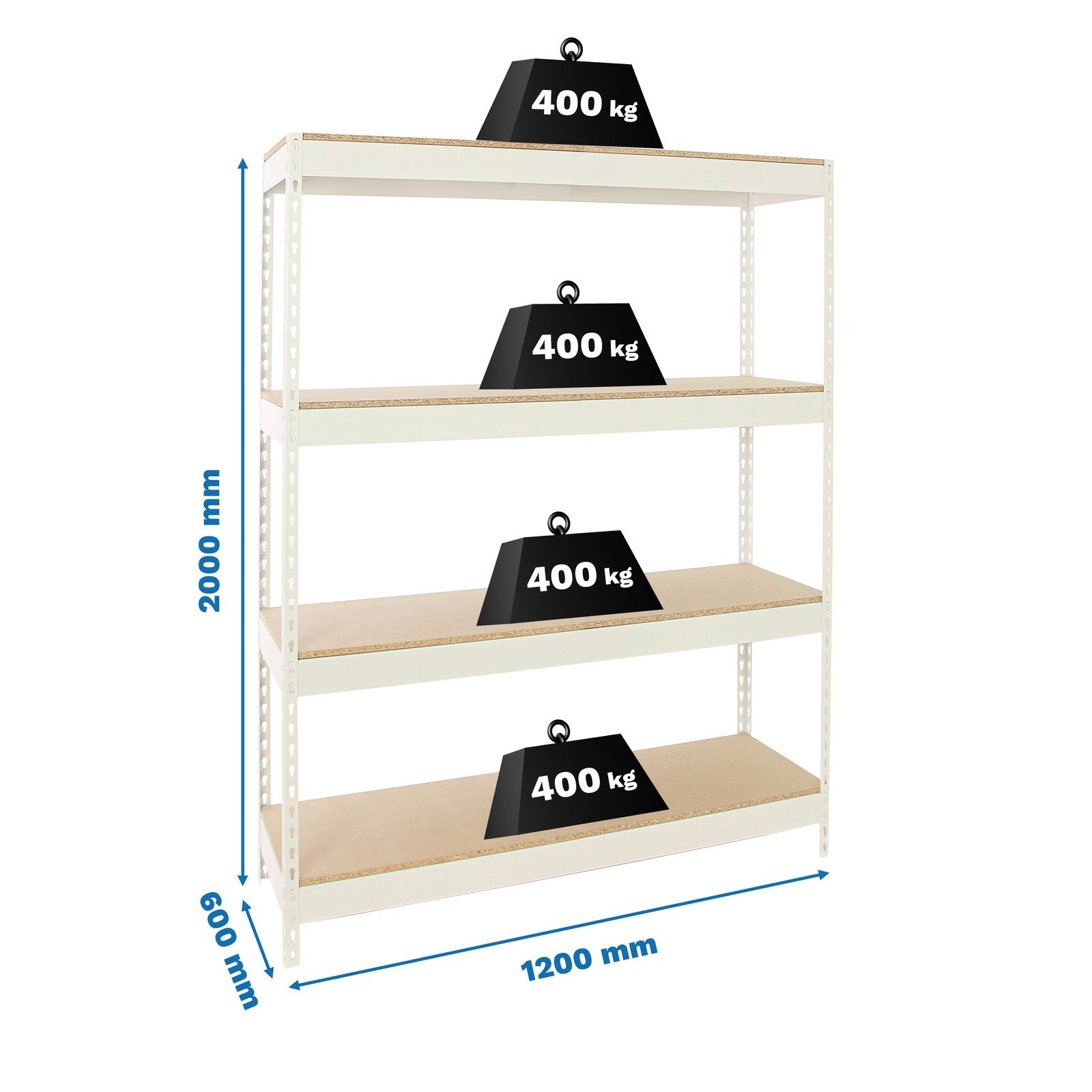 Estanteria metalica media carga de color blanco/madera con 4 alturas. Tiene una capacidad de carga por estante de 400 kg y una capacidad total de 1600 kgs, carga certificada a punto de flexion, no de rotura. Con unas medidas en mm (alto x ancho x fondo) de 2000x1200x600. Incluye 4 bandejas de aglomerado. Fabricada en Europa por Simonrack y se monta rapido siguiendo las instrucciones. Sistema de montaje facil y rapido sin tornillos. Con recubrimiento epoxi poliester antirayaduras e ignifugo. No se tambalea. No contiene aristas de corte, manipulacion sin riesgo