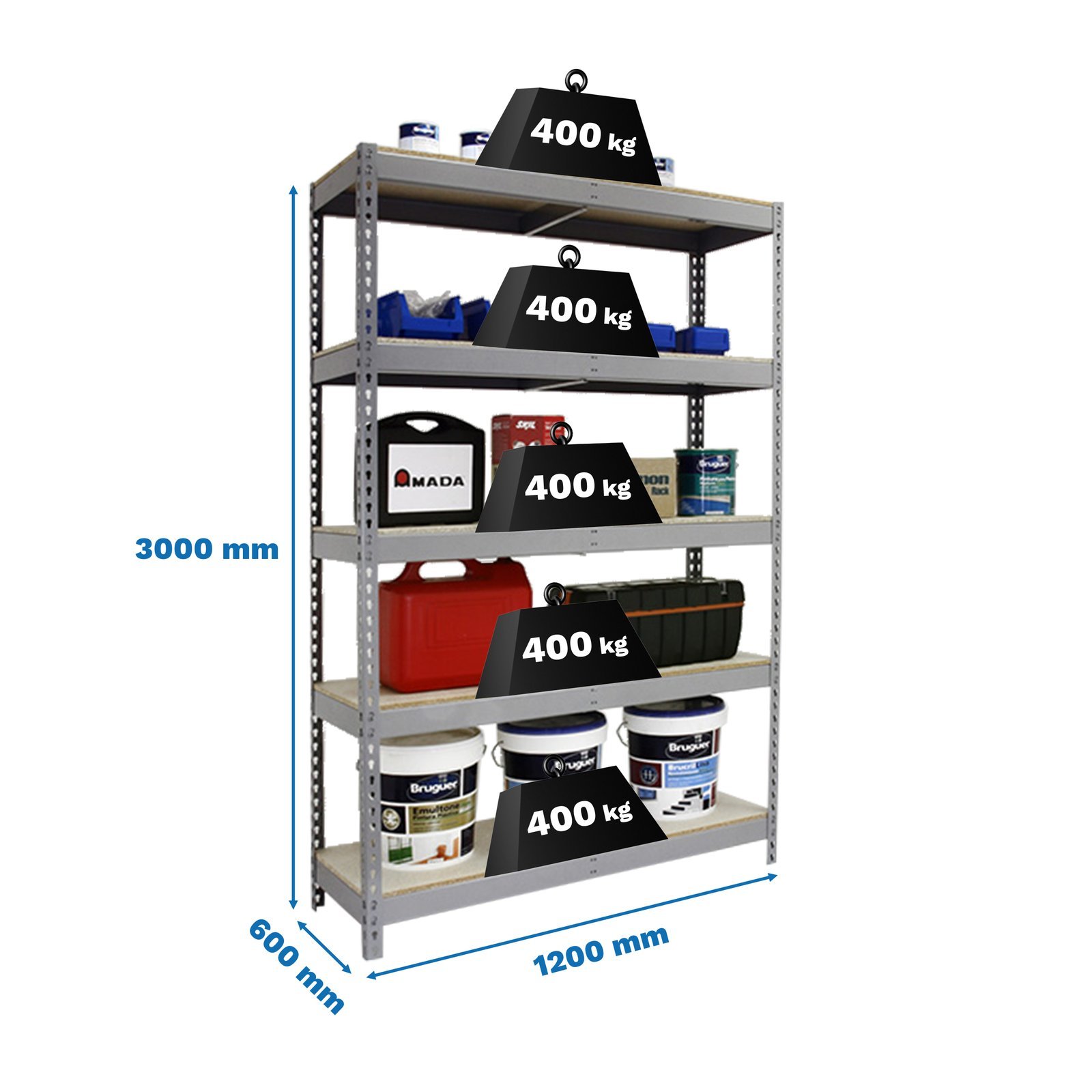 Estanteria metalica media carga de color gris/madera con 5 alturas. Tiene una capacidad de carga por estante de 400 kg y una capacidad total de 2000 kgs. Con unas medidas en mm de 3000x1200x600. Incluye 5 bandejas de aglomerado. Fabricada en Europa por Simonrack y se monta rapido siguiendo las instrucciones