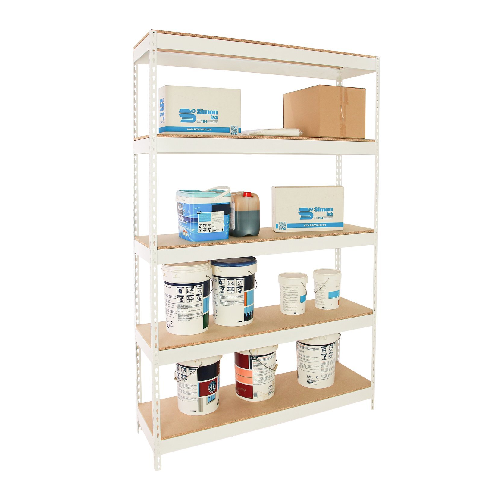 Estanteria metalica media carga de color blanco/madera con 5 alturas. Tiene una capacidad de carga por estante de 400 kg y una capacidad total de 2000 kgs, carga certificada a punto de flexion, no de rotura. Con unas medidas en mm (alto x ancho x fondo) de 2000x1200x600. Incluye 5 bandejas de aglomerado. Fabricada en Europa por Simonrack y se monta rapido siguiendo las instrucciones. Sistema de montaje facil y rapido sin tornillos. Con recubrimiento epoxi poliester antirayaduras e ignifugo. No se tambalea. No contiene aristas de corte, manipulacion sin riesgo