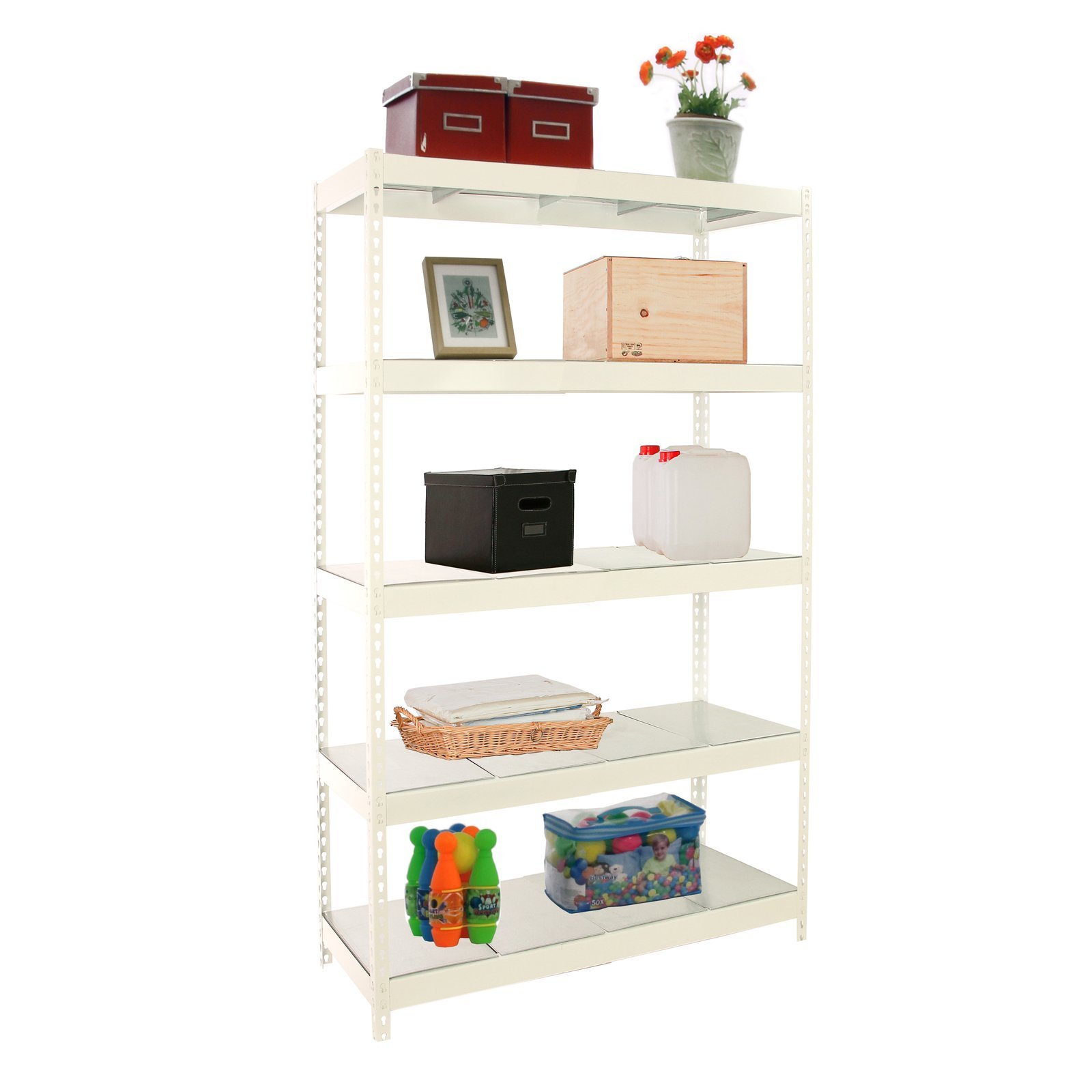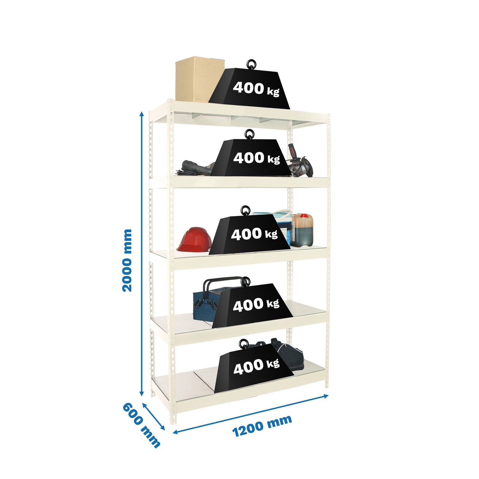 Estanteria metalica media carga de color blanco/galva con 5 alturas. Tiene una capacidad de carga por estante de 400 kg y una capacidad total de 2000 kgs, carga certificada a punto de flexion, no de rotura. Con unas medidas en mm (alto x ancho x fondo) de 2000x1200x600. Incluye bandejas de metal. Fabricada en Europa por Simonrack y se monta rapido siguiendo las instrucciones. Sistema de montaje facil y rapido sin tornillos. Con recubrimiento epoxi poliester antirayaduras e ignifugo. No se tambalea. No contiene aristas de corte, manipulacion sin riesgo