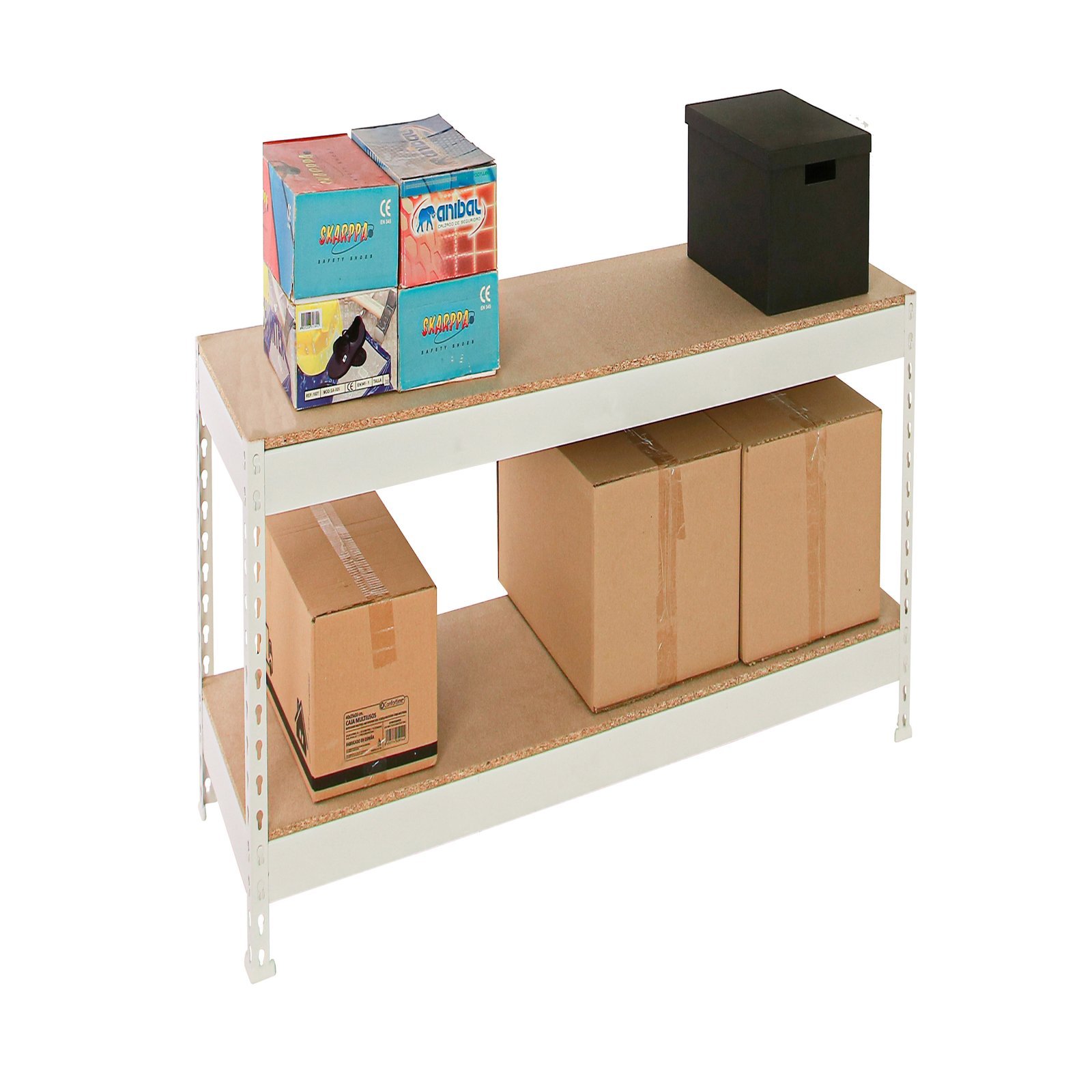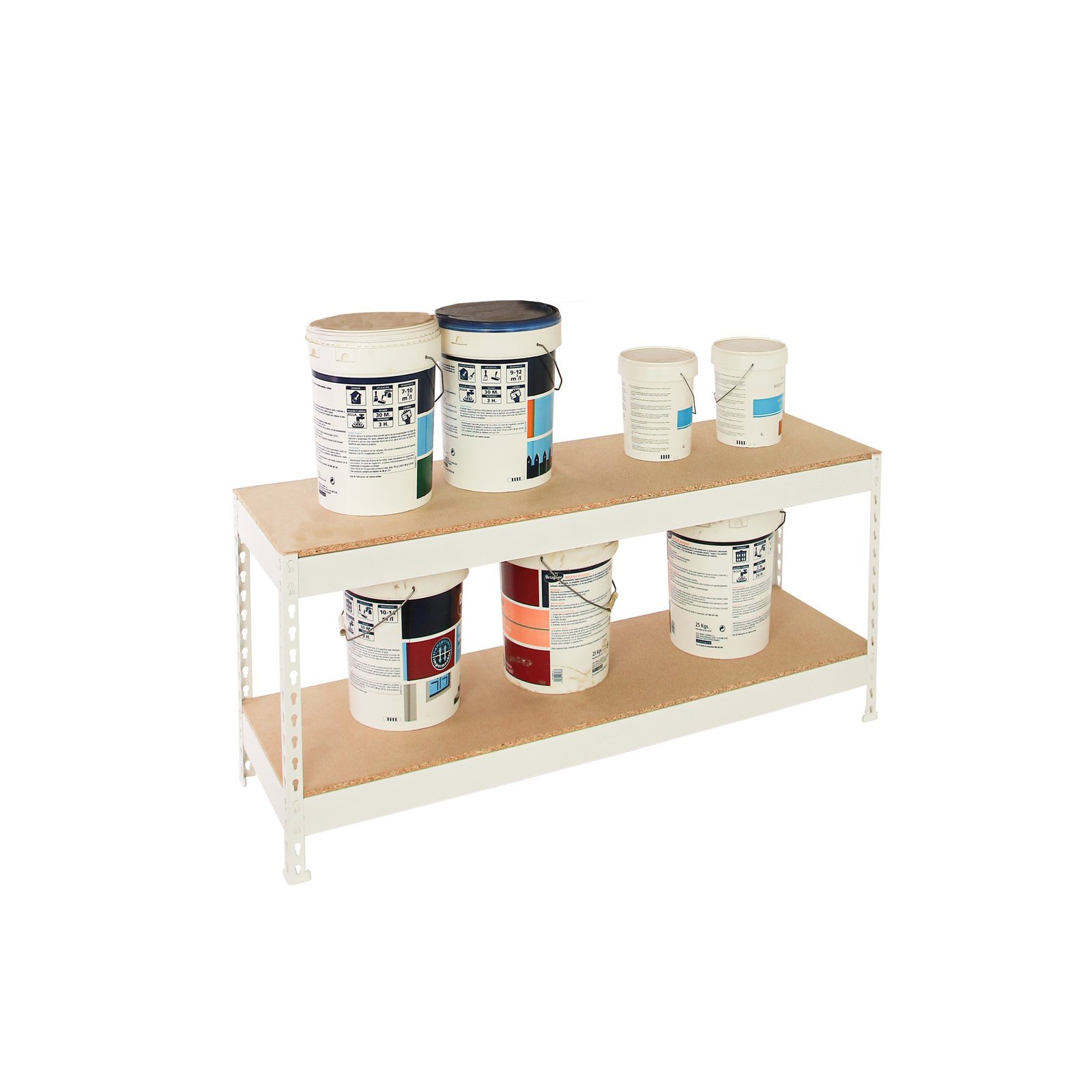 Estanteria metalica media carga de color blanco/madera con 2 alturas. Tiene una capacidad de carga por estante de 400 kg y una capacidad total de 800 kgs, carga certificada a punto de flexion, no de rotura. Con unas medidas en mm (alto x ancho x fondo) de 900x1200x750. Incluye 2 bandejas de aglomerado. Fabricada en Europa por Simonrack y se monta rapido siguiendo las instrucciones. Sistema de montaje facil y rapido sin tornillos. Con recubrimiento epoxi poliester antirayaduras e ignifugo. No se tambalea. No contiene aristas de corte, manipulacion sin riesgo