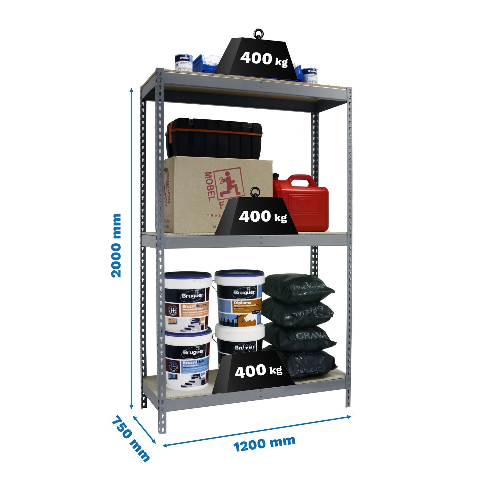 Estanteria sin tornillos Ecoforte de medidas 1500x1200x750 mm. De color GRIS/MADERA. Su capacidad de carga es de 400 kgs por estante. Certificamos a punto de flexion, no de rotura. Tiene 3 alturas. Incluye 3 bandejas de aglomerado. No contiene aristas de corte. Producto fabricado en Europa por Simonrack