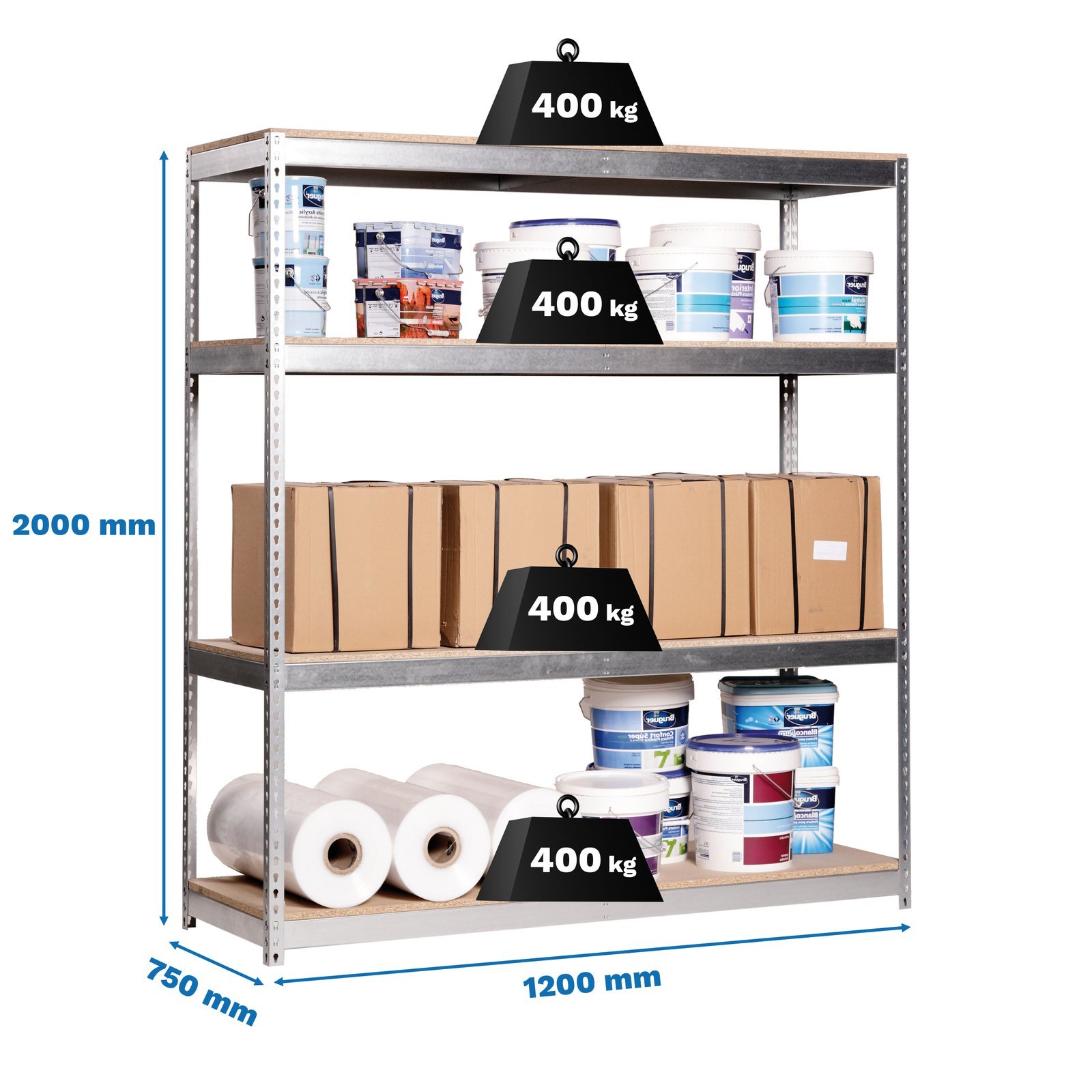 Estanteria metalica sin tornillos de color GALVA/MADERA con capacidad de carga por estante de 400 kg. El numero de alturas es 4, incluye 4 bandejas de aglomerado y las medidas (alto x ancho x fondo) son 2000x1200x750 mm. Producto europeo, calidad europea, podras encontrar las intrucciones de montaje en su interior o en este enlace, https, //www. youtube. com/watch?v=4HO6NqZuG-s. Medidas en uso del producto, 1975x1210x760 mm