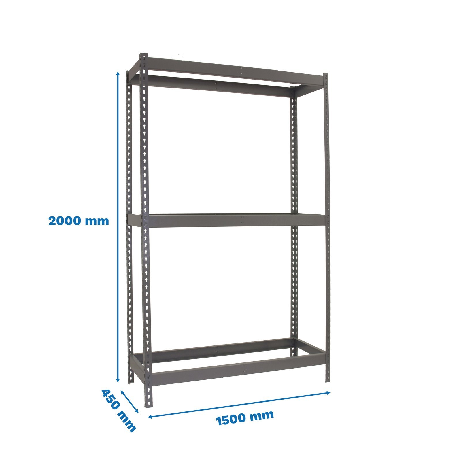 Estanteria metalica media carga de color gris con 3 estantes. Tiene una capacidad de carga por estante de 400 kg y una capacidad total de 1200 kgs. Con unas medidas en mm de 2000x1500x450. No Incluye bandejas de metal, ni aglomerado. Fabricada en Europa por Simonrack y se monta rapido siguiendo las instrucciones