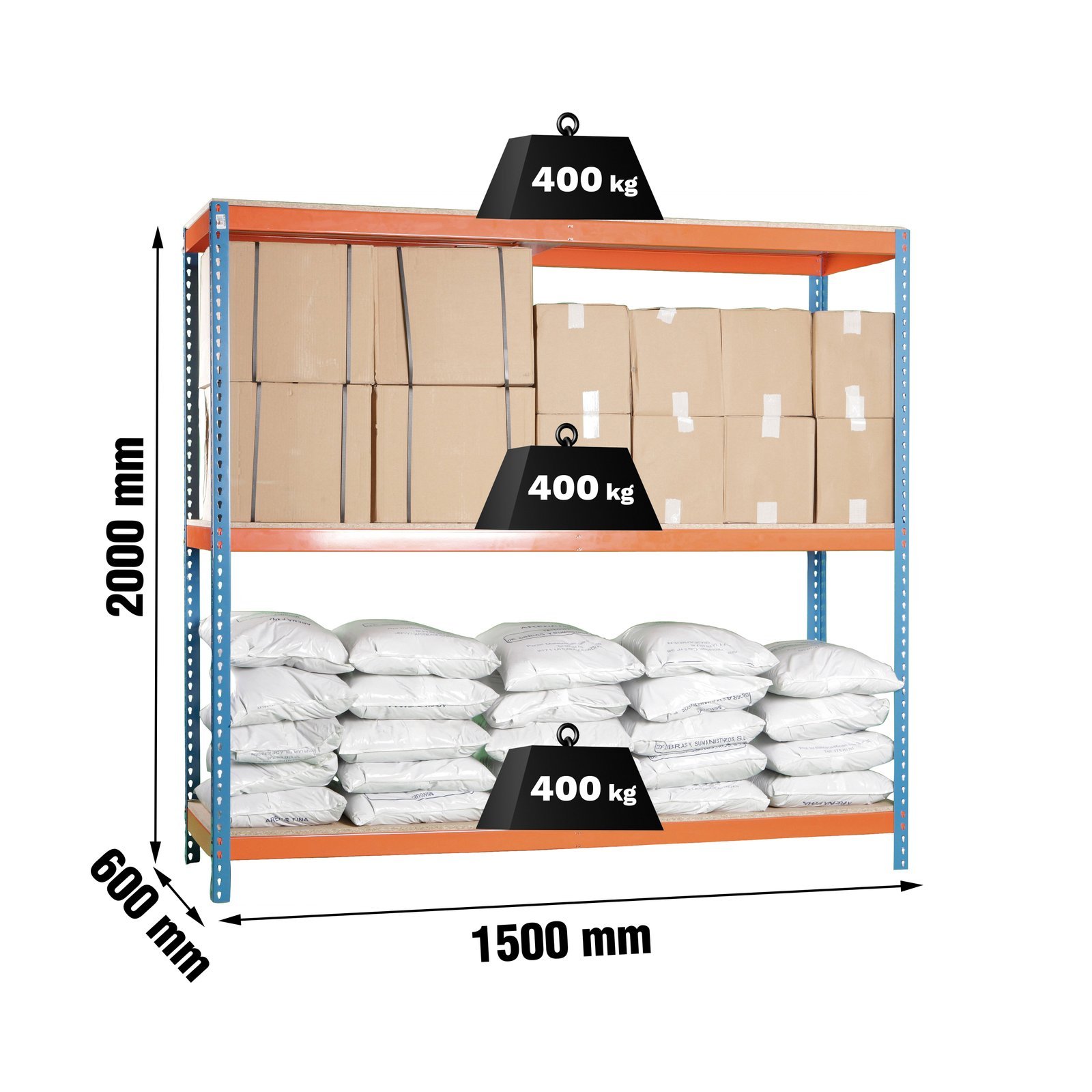 Estanteria metalica sin tornillos de color AZUL/NARANJA/MADERA con capacidad de carga por estante de 400 kg. Tiene 3 alturas. Contiene 6 baldas de aglomerado, 2 baldas para cada altura, una de las baldas mas larga que la otra. Las medidas (alto x ancho x fondo) son 2000x1500x600 mm. Producto europeo, calidad europea, podras encontrar las intrucciones de montaje en su interior o en este enlace, https, //www. youtube. com/watch?v=4HO6NqZuG-s. Medidas en uso del producto, 1975x1510x610 mm. Incluye 1 refuerzo por altura
