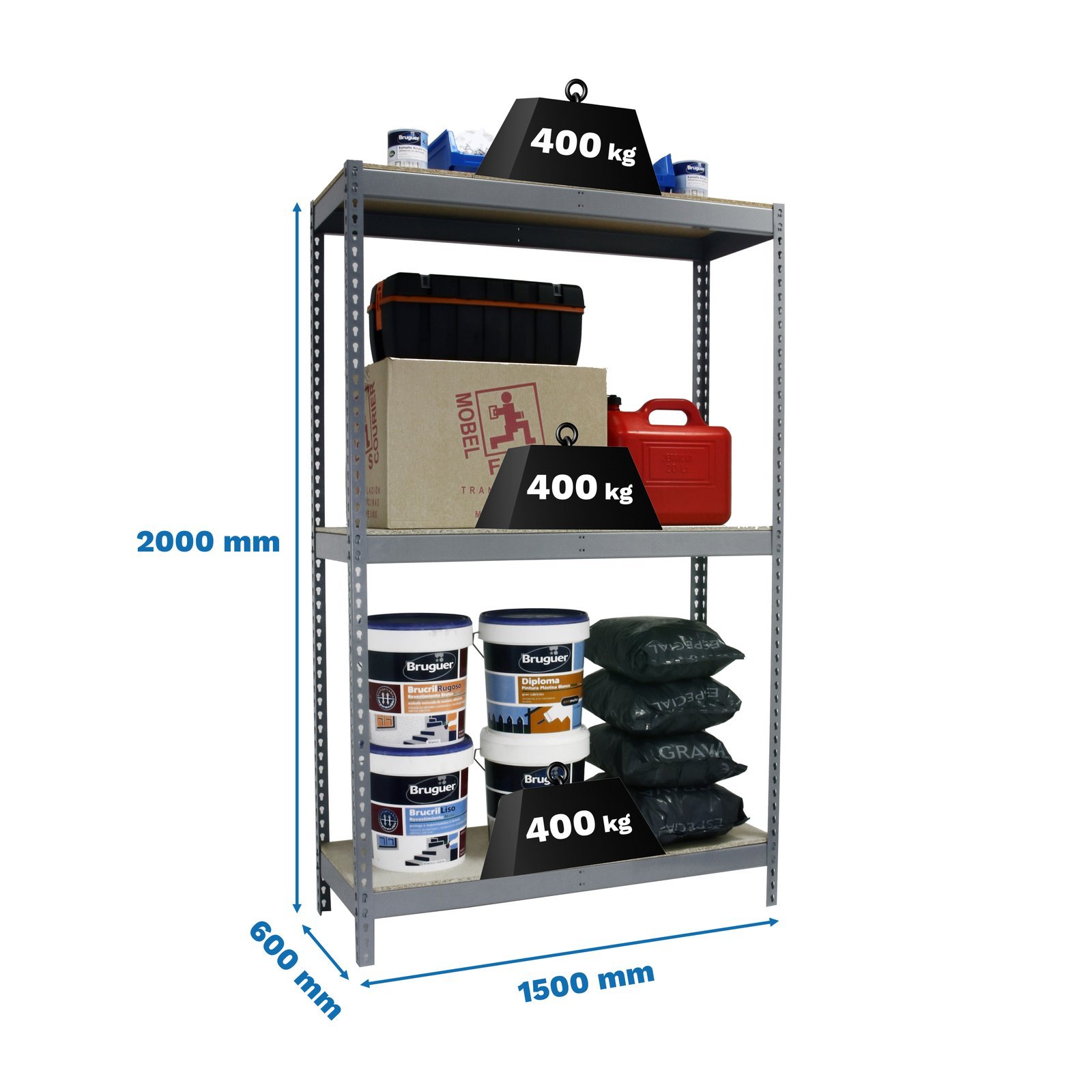 Estanteria metalica media carga de color gris/madera con 3 alturas. Contiene 6 baldas de aglomerado, 2 baldas para cada altura, una de las baldas mas larga que la otra. Tiene una capacidad de carga por estante de 400 kg y una capacidad total de 1200 kgs. Con unas medidas en mm de 2000x1500x600. Fabricada en Europa por Simonrack y se monta rapido siguiendo las instrucciones. Incluye 1 refuerzo por altura