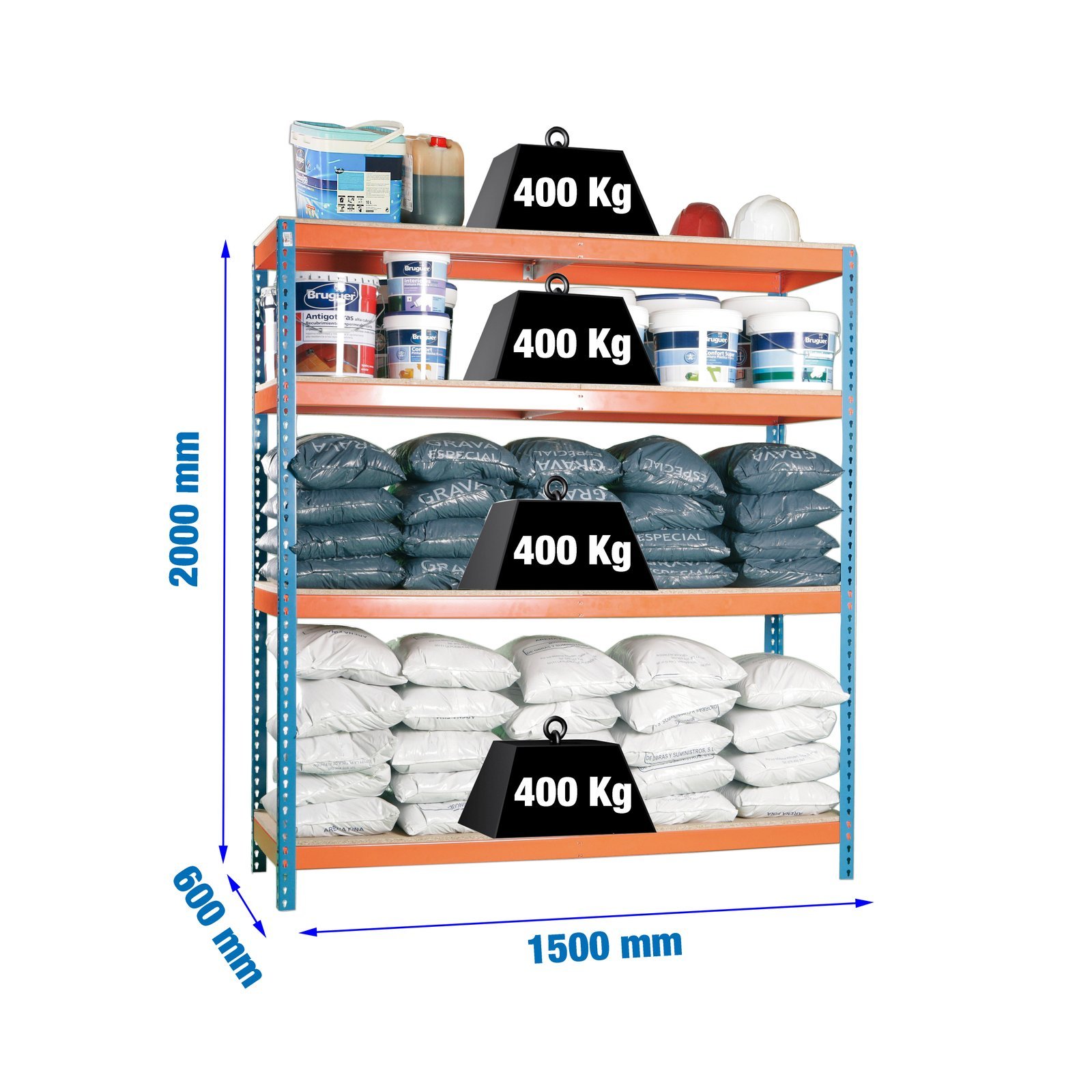 Estanteria metalica sin tornillos de color AZUL/NARANJA/MADERA con capacidad de carga por estante de 400 kg. Tiene 4 alturas. Contiene 8 baldas de aglomerado, 2 baldas para cada altura, una de las baldas mas larga que la otra. Las medidas (alto x ancho x fondo) son 2000x1500x600 mm. Producto europeo, calidad europea, podras encontrar las intrucciones de montaje en su interior o en este enlace, https, //www. youtube. com/watch?v=4HO6NqZuG-s. Medidas en uso del producto, 1975x1510x610 mm. Incluye 1 refuerzo por altura