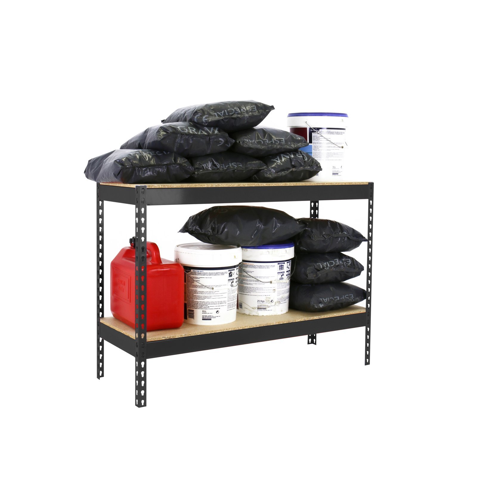 Estanteria media carga sin tornillos Ecoforte 900x1500x750 mm. De color ANTRACITA/MADERA. La capacidad de carga es de 400 kgs. Tiene 2 alturas y 4 agloremados, 2 por altura. Incluye 1 refuerzo por altura