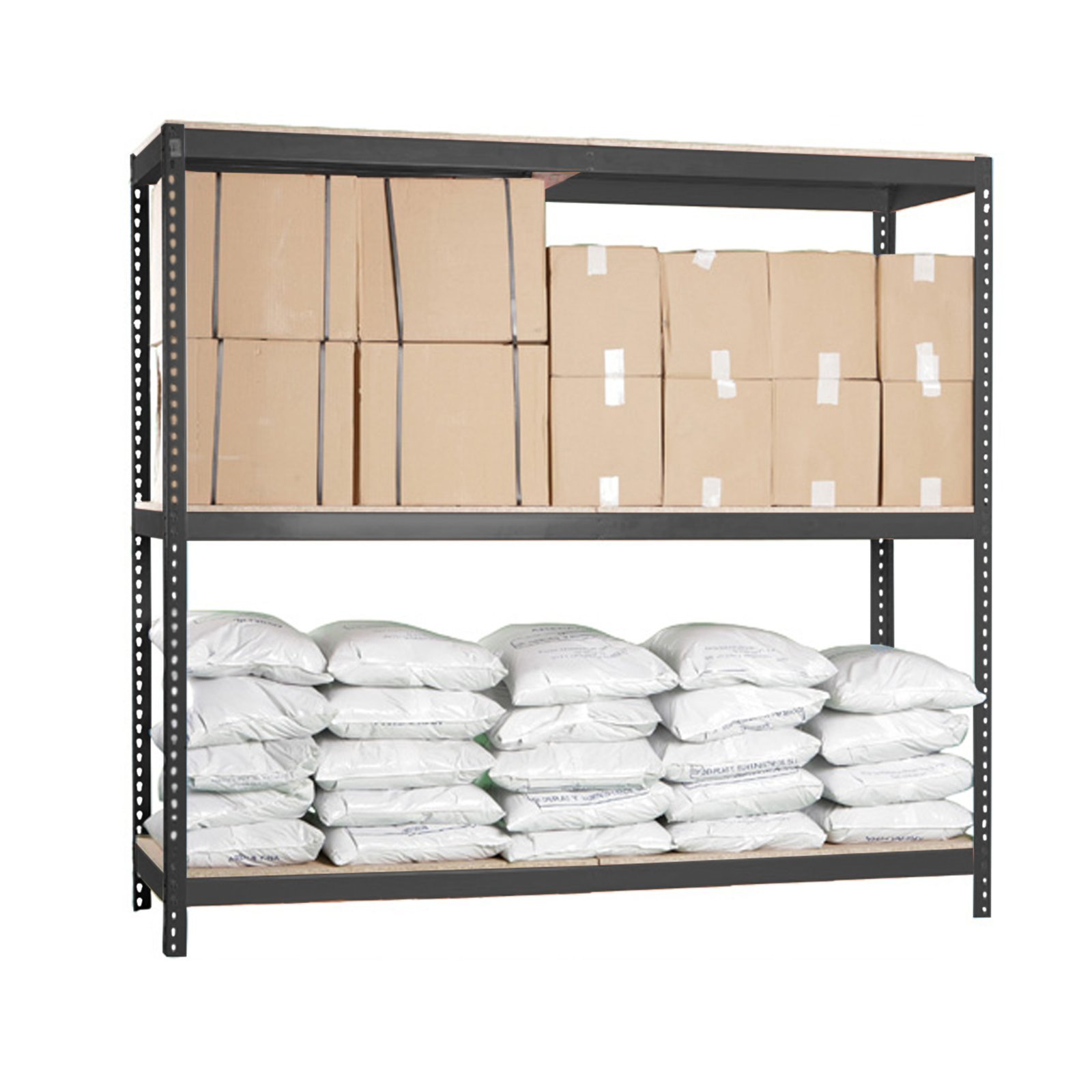 Estanteria media carga sin tornillos Ecoforte 1500x1500x750 mm. De color ANTRACITA/MADERA. La capacidad de carga es de 400 kgs. Tiene 3 alturas y 6 agloremados, 2 por altura. Incluye 1 refuerzo por altura