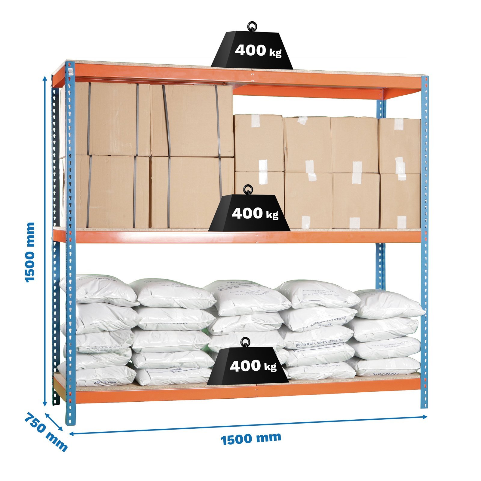 Estanteria metalica media carga de color azul/naranja/madera con 3 alturas. Contiene 6 baldas de aglomerado, 2 baldas para cada altura, una de las baldas mas larga que la otra. Tiene una capacidad de carga por estante de 400 kg y una capacidad total de 1200 kgs. Con unas medidas en mm de 1500x1500x750. Fabricada en Europa por Simonrack y se monta rapido siguiendo las instrucciones. Incluye 1 refuerzo por altura