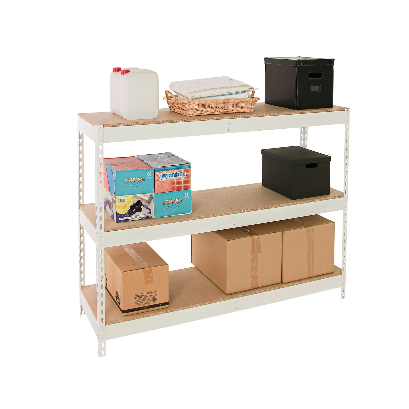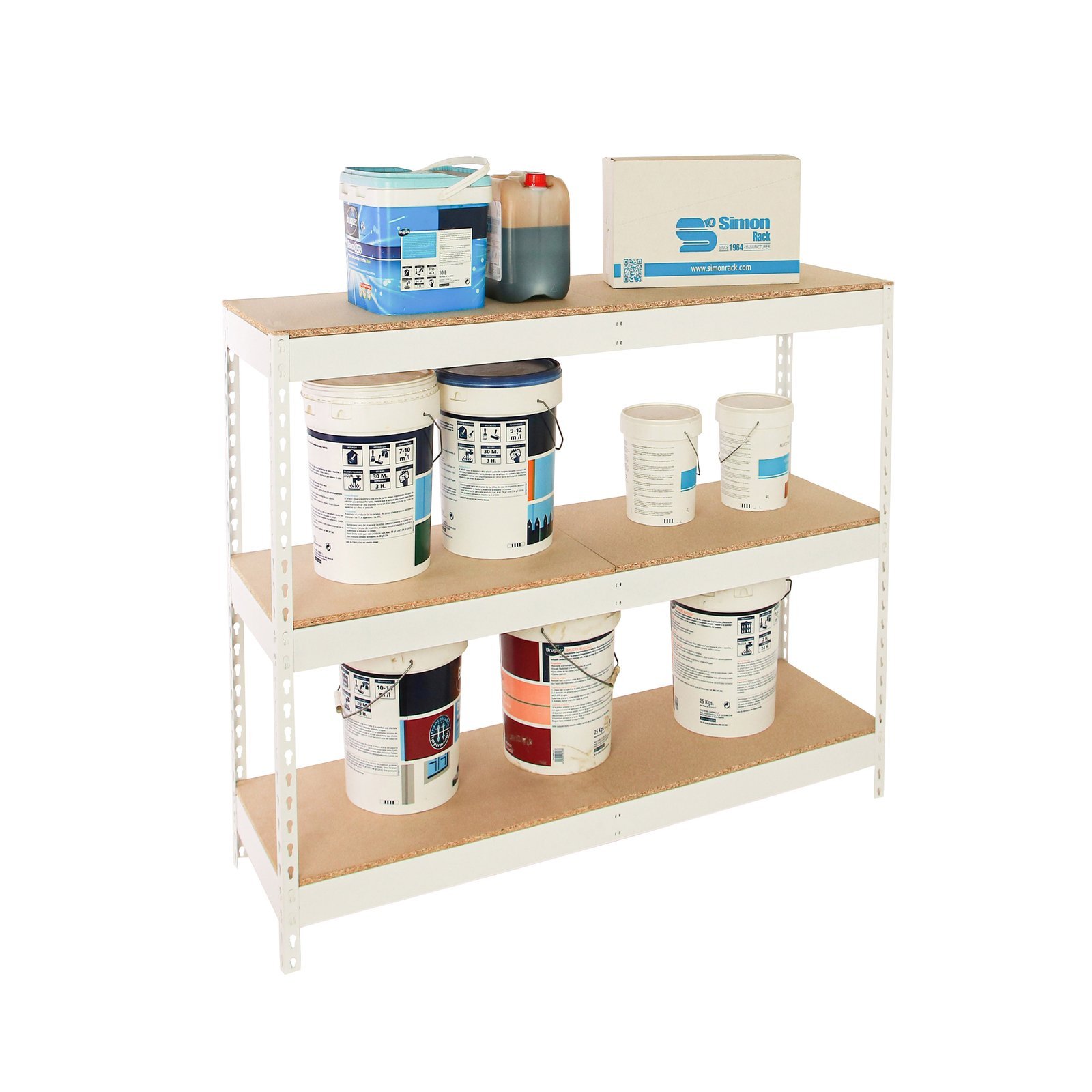 Estanteria metalica media carga de color blanco con 3 alturas. Contiene 6 baldas de aglomerado, 2 baldas para cada altura, una de las baldas mas larga que la otra. Tiene una capacidad de carga por estante de 400 kg y una capacidad total de 1200 kgs. Con unas medidas en mm de 1500x1500x750. Fabricada en Europa por Simonrack y se monta rapido siguiendo las instrucciones. Incluye 1 refuerzo por altura