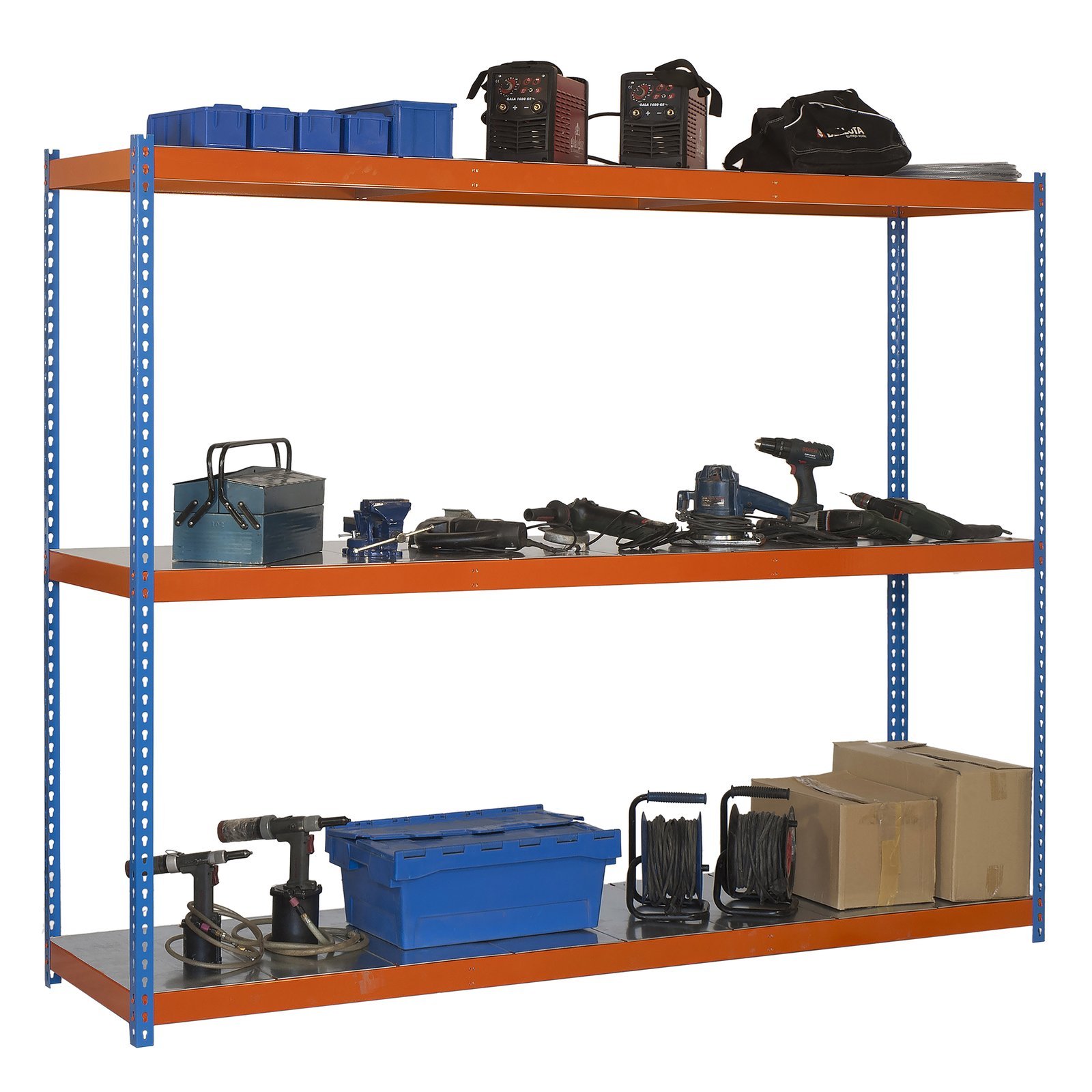 Estanteria metalica media carga de color azul/naranja/galva con 3 estantes. Tiene una capacidad de carga por estante de 400 kg y una capacidad total de 1200 kgs. Con unas medidas en mm de 1500x1500x750. Incluye bandejas de Metal. Fabricada en Europa por Simonrack y se monta rapido siguiendo las instrucciones